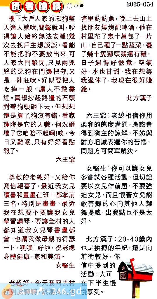 第零五四期讀者論談 1.樓下大戶人家的惡狗整天逢人就吠,聞聲就叫,吵得讓人始終無法安睡!幾次去找戶主想談談,看能不能把狗不要放出來,可人家大門緊閉,只見兩兒兕的惡狗在門邊把守,又是一陣狂吠。好似要把人吃掉一般,讓人不敢靠近。真想抄起路邊的石頭對蓍狗頭砸下去,但想想還是算了,狗沒有錯,看家護院是它的天職,何況砸壞了它咱賠不起啊!唉,今日又難眠,只有好好看貼報了。六王爺 〖六王爺〗:老總相信你用柔和的態度溝通,應該會得到狗主的諒解,不妨與對方坦誠表達你的苦惱,問題方可簡單解決。 2.尊敬的老總好,又給你寫信報喜了,最近我女兒讀書和畫畫在班上都拿前三名,特别是查查。最近我在想要不要讓我女兒學習鋼琴,要讓全村的人都知道我女兒琴書畫都會,也讓我做母親的得瑟一下,嘿嘿!好啦,祝老總身體健康,家和美滿。女醫生 〖女醫生〗:你可以讓女兒多嘗試各種活動,但切記要以女兒作前題,不要強迫女兒,而且懷著女兒能歌善舞的心向其他人耀舞揚威,出發點也不是太好。 3.老叔好,今天我回去村裡到處轉轉,跟朋友去池塘里釣釣魚,晚上去山上找朋友燒烤配啤酒,他在村里花了幾十萬包了一片山,自己種了一點蔬菜,養了幾十隻獅頭鵝還有雞,日子過得好愜意,空氣好,水也甘甜,我在想等我退休了,我現在很好賺錢。北方漢子 〖北方漢子〗:20-40歲內也是拚搏的年紀,還是向前衝較好,你信中提到的活動,大可在下半生慢慢享受。