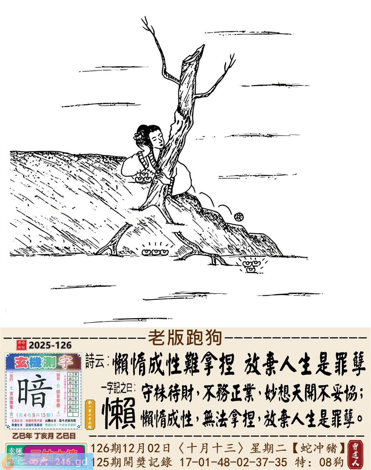 2025年11月29日126期侯(丙申)(金箔金) 126期:老版跑狗玄機一字記之曰:【懶】 詩云:懶惰成性難拿捏放棄人生是罪孽 守株待財,不務正業,妙想天開不妥協; 懶惰成性,無法拿捏,放棄人生是罪孽。 玄機測字:《暗》 密圖詩:十次買一有時中 《記》:一日文章拜布衣 特碼大小單雙句:方圓十里無客棧 今期必中:張飛 126期:特碼歇后語 掉进水里的鞭炮-----给谁都不要 126期正版四字梅花诗:龙争虎斗。 126期火车头:烧伤狗。诗:猴死龙伤,无穷二四过一边。 126期香港第一手欲钱料:大名鼎鼎? 126期曾道人说:“厨娘?” 126期另版四字梅花诗:七十二变。 126期香港第一手欲钱料:欲钱找世界最高楼。 126期曾道人说:“为什么现代的人喜欢赌博”? 126期:二字經:三九 126期:高丽参是特码 126期:智力金壤:烟雨蒙蒙 126期:信箱紅字:【觸手生花】 126期:【暗碼:02062738】 126期:一語中特:【三姑六婆】 發財玄機圖:挖空心思絞盡腦汁 圖中明狗紅藍 126期:藏寳圖 新:造化无心本不知 老:流到前溪无半语 禁:兔禁:8尾玄机字《离》 2025年126期【生活幽默】版 〖好友〗 古時候,有一個和尚跟一個屠夫是好友。 和尚早上要起來念經,而屠夫要起來殺猪。爲了不耽誤各自工作,便約定早上互相叫對方起床。 多年後和尚與屠夫去世了。屠夫去了天堂,和尚却下了地獄。因爲屠夫天天做善事,叫和尚起來念經;而和尚天天叫屠夫起來殺生。