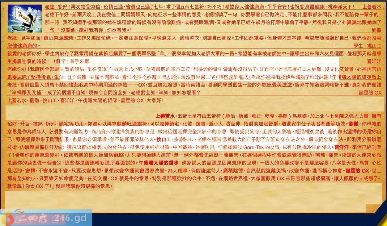 第046期《六合皇信箱文字版》10000%正確!!!正版二四六論壇*精心製作!!! 上善若水、劉徹、挑山工、喜洋洋、午後曬太陽的貓咪、曾經的,大家好! 【1】.老總:您好!再次給您寫信,疫情已過,會員也已過了七年,求了個五帝七星符,巧不巧!希望家人健健康康,平平安安!也祝您身體健康,桃李滿天下!上善若水 〖上善若水〗:五帝七星符由五帝符(順治、康熙、雍正、乾隆、嘉慶)為基礎,加上北斗七星陣之強大力量,擁有招財、升官、擋煞、辟邪、鎮宅等功用。你還可以再求麒麟旺運靈符,可以發揮鎮宅、化煞、趨貴、避小人,防官非,招財助加冠晉爵,增進家中仕子功名考運等功效。 【2】.老總下午好。前兩天晚上我在微信上同媽媽聊天,向她征求一些事情的意見,老媽卻說了一句:你要學著自己做決定,不能什麼事都來問我,我不能陪你一輩子的。那一時,我不知道手機那頭的她在說這話的時候有沒有偷偷難過,或者雙眼濕潤,又或者她早已經在歲月的打磨中學會了平靜。然後我只是小心翼翼地跟她說了句:"沒關係,還好我有你,你也有我。”劉徹 〖劉徹〗:你母親的意思是作為成年人,必須要有決斷能力。而為自己的選擇負责的意思是,做出這個選擇完全出於你的意思,即使受到父母、重要的人影響,經過權衡之後,最後作出選擇的仍是你自己。即使選擇帶來了負面結果,也是你必須承擔,並不能怪罪於其他人。 【3】.老總:見字如面!最近氣溫驟降,工作又那麼忙碌,一定要注意保暖。早晚溫差大,適時添衣,別讓自己著凉。工作固然重要,但身體才是本錢,希望您能照顧好自己,我們也都盼著您健健康康的。學生:挑山工 〖挑山工〗:多謝關心,老總在這種温差較大的日子除了洋蔥式穿衣法之外,還有黃金穿衣法。即利用分層鎖溫技術,內層應具備排汗功能,選擇聚酯纖維製成的發熱衣,避免使用純棉材質。中層蓄熱,外層防風,可選擇類似-的材質,以有效阻擋冷風的侵入。 【4】.親愛的老師你好,學生終於存了點零用錢在紫飾店購買了一個翡翠吊墜「羊」。很榮幸能加入老師大軍的一員。希望能有幸被老師抽中。讓學生出來和六友見個面。登榜那天就是學生揚眉吐氣的時候!!紅字:順手來牽喜洋洋 〖喜洋洋〗:來信已經刊登了!希望你的運氣會變好。依據老總的個人經驗與觀察,人只要開始轉大運前,無一例外都會先經歷一陣痛苦。在這個過程中你會處處覺得無助、煎熬、痛苦。所謂的大運來到就是跟你的過去做一個告別,這些都是舊運轉新運所要面對的。 【5】.老總你好!我廠因全部是歐盟的產品現在沒單了,每天上八小時,拿著最底的基本工資,想拼命的做牛做馬都沒得做了,好難啊,做個底層打工人更難,沒文化沒背景,心裡再苦再累委屈除了堅持後退,生活,日子很難,委屈不得隱藏,任不得不承擔底層人的生活沒有容易二字。唯有改變現狀,老總你能給我指條明路嗎?萬分感謝!午後曬太陽的貓咪敬上 〖午後曬太陽的貓咪〗:佛家說人的命運是因果規律的呈現,一個人的命要改變不是那麼容易,八字是天性、為質,心性是活的、會轉,不會永遠不變。只要改變思想,思想改變命運就會跟著改變。為人處事,倘能謙虛待人,廣積陰德,自然就能遠離災禍,改變命運,進而稱心如意。 【6】.老總,看到信里人頭馬不禁回憶起我高中時期用過的綽號——,並且臉紅發燙。當時英語差,看到同學送個猛一些的外號感覺美滋滋,後來才知道這詞略帶不雅。真如我們俚語“半桶屎孔孔搖”,成了笑柄還不自知!現如今自間沒全知,老總對全知、半知、無知怎麼看?曾經的 〖曾經的〗:世上那有全知的人,只要樂天知命便足夠。在英文裡,就是牛的意思,特別是那種強壯的公牛。不過,在網路世界裡,大家喜歡用來形容那些超級厲害、讓人佩服的人或事了。就像說「你太了」就是誇讚你超級棒的意思。 紅字:含辛忍苦 暗码:11163641 [释义]形容忍受辛苦或吃尽辛苦。 [出处]《二刻拍案惊奇》卷二十:“至于商家,连疑心也不当人子,只好含辛忍苦,自己懊悔怨怅,没个处法。”