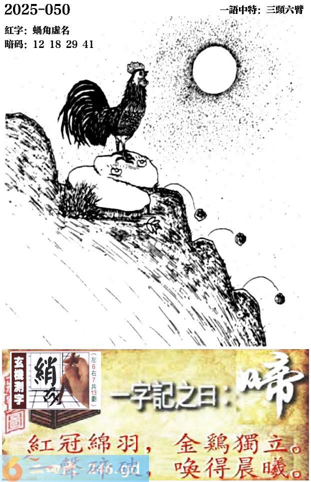 050期跑狗一字記之曰:【啼】 紅冠綿羽,金雞獨立。 壹聲碲破,喚得晨曦。 玄機測字:《綃》 一語中特:三頭六臂