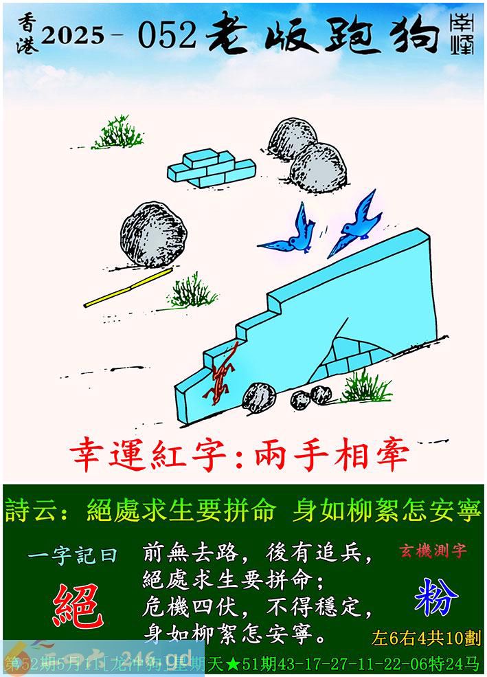 052期老版跑狗一字記之曰:【絕】 詩雲:絕處求生要拼命,身如柳絮怎安寧。