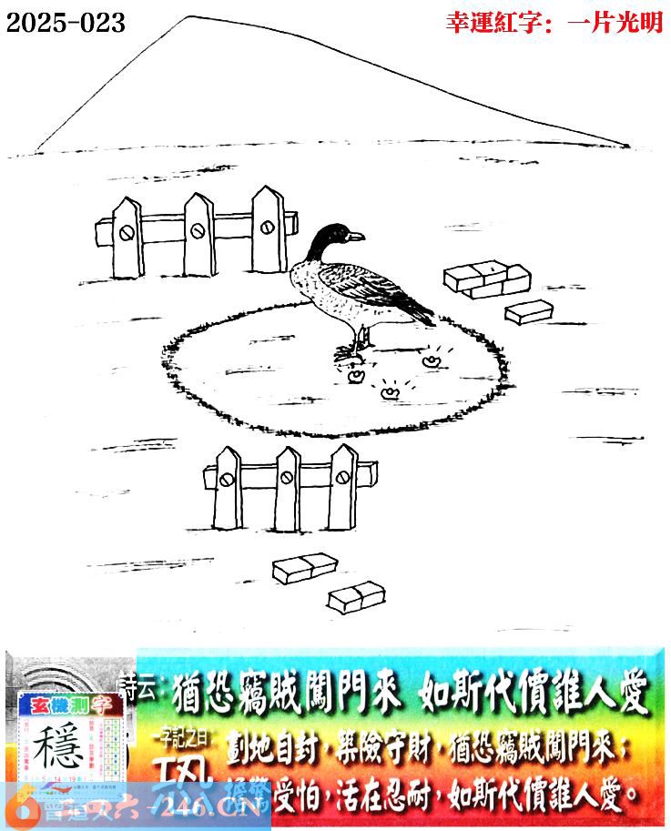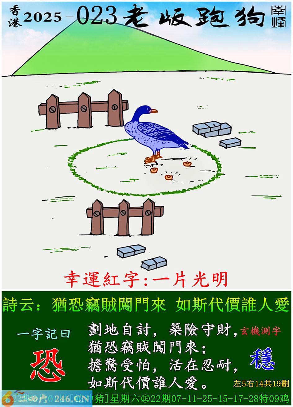 023期老版跑狗一字記之曰:【恐】 詩雲:猶恐竊賊闖門來,如斯代價誰人愛。 劃地自討,築險守財,猶恐竊賊闖門來; 擔驚受怕,活在忍耐,如斯代價誰人愛。 玄機測字:《穩》