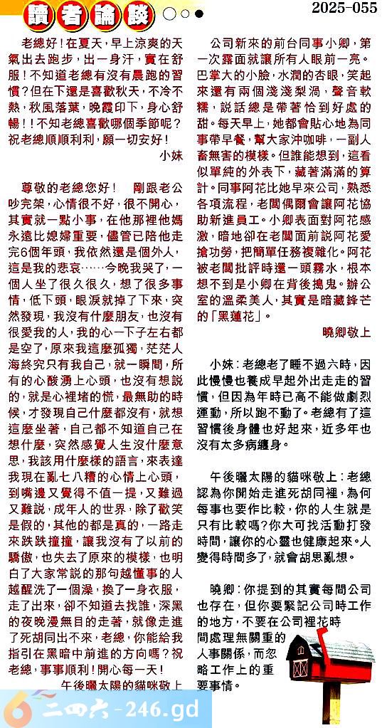 第零五五期讀者論談 1.老總好!在夏天,早上凉爽的天氣出去跑步,出一身汗,實在舒服!不知道老總有沒有晨跑的習慣?但在下還是喜歡秋天,不冷不熱,秋風落葉,晚霞印下,身心舒暢!!不知老總喜歡哪個季節呢?祝老總順順利利,願一切安好!小妹 〖小妹〗:老總老了睡不過六時,因此慢慢也養成早起外出走走的習慣,但因為年時已高不能做劇烈運動,所以跑不動了。老總有了這習慣後身體也好起來,近多年也沒有太多病纏身。 2.尊敬的老總您好!剛跟老公吵完架,心情很不好,很不開心,其實就一點小事,在他那裡他媽永遗比媳婦重要,儘管已陪他走完6個年頭,我依然還是個外人,這是我的悲哀......今晚我哭了,一個人坐了很久很久,想了很多事情低下頭眼淚就掉了下來,突然發現,我沒有什麼朋友,也沒有很爱我的人,我的心一下子左右都是空了,原來我這麼孤獨,茫茫人海終究只有我自己,就一瞬間,所有的心酸湧上心頭,也沒有想說的,就是心裡堵的慌,最無助的時候,才發現自己什麼都沒有,就想這麼坐著,自己都不知道自己在想什麼,突然感覺人生沒什麼意思,我該用什麼樣的語言來表達我現在亂七八糟的心情上心頭,到嘴邊又覺得不值一提,又難過又難說,成年人的世界,除了歡笑是假的,其他的都是真的,一路走來跌跌撞撞,讓我沒有了以前的驕傲,也失去了原來的模樣,也明白了大家常說的那句越懂事的人越醒洗了一個澡,換了一身衣服,走了出来,卻不知道去找誰,深黑的夜晚漫無目的走著,就像走進了死胡同出不來,老總,你能給我指引在黑暗中前進的方向嗎?祝老總,事事顺利!開心每一天!午後曬太陽的貓咪敬上 〖午後曬太陽的貓咪敬上〗:老總認為你開始走進死胡同裡,為何每事也要作比較,你的人生就是只有比較嗎?你大可找活動打發時間,讓你的心靈也健康起來。人變得時間多了,就會胡思亂想。 3.公司新來的前台同事小卿,第一次露面就讓所有人眼前一亮.巴掌大的小臉,水潤的杏眼,笑起來還有兩個淺淺梨渦,聲音軟糯,說話總是帶著恰到好處的甜。每天早上,她都會贴心地為同事帶早餐,幫大家沖咖啡,一副人畜無害的模樣。但誰能想到,這看似單纯的外表下,藏著滿滿的算計。同事阿花比她早来公司,熟悉各項流程,老閶偶兩會讓阿花協助新進員工。小卿表面對阿花感激,暗地卻在老闆面前說阿花爱搶功勞,把簡單任務複雜化。阿花被老闆批評時還一頭霧水,根本想不到是小卿在背後搗鬼。辦公室的温柔美人,其實是暗藏鋒芒的「黑蓮花」。曉卿敬上 〖曉卿〗:你提到的其實每間公司也存在,但你要緊記公司時工作的地方,不要在公司裡花時間處理無關重的人事關係,而忽略工作上的重要事情。