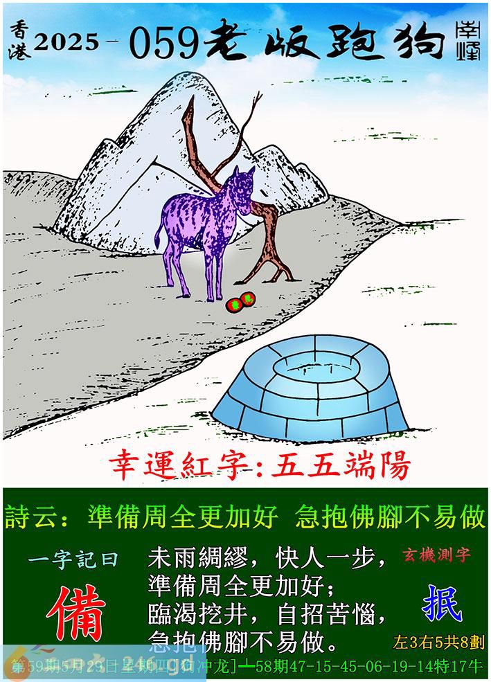 059期老版跑狗一字記之曰:【備】 詩雲:準備周全更加好,急抱佛腳不易做。