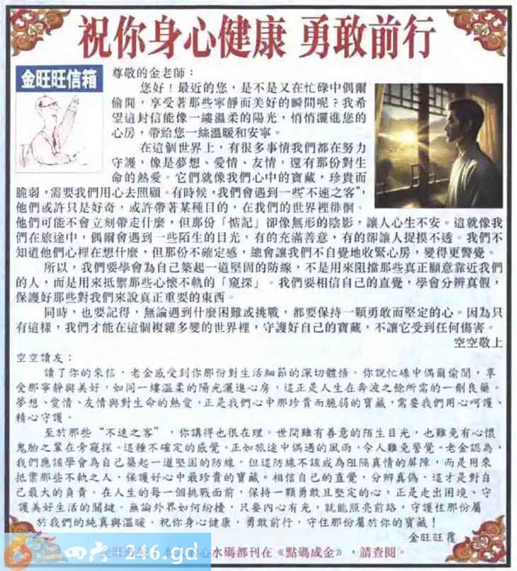 2025065期065期:金旺旺信箱彩民推荐→→《祝你身心健康 勇敢前行》