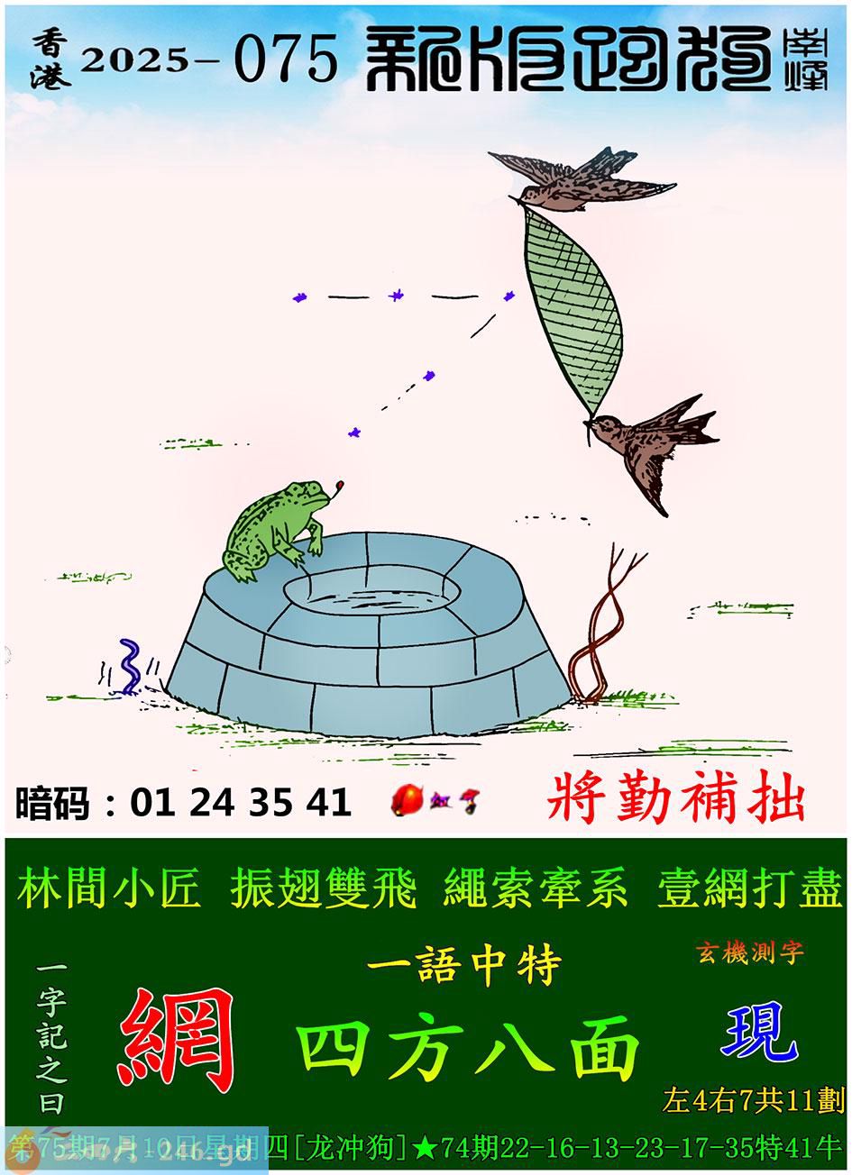 075期跑狗一字記之曰:【網】 林間小匠,振翅雙飛。 繩索牽系,壹網打盡。 玄機測字:《現》 一語中特:四方八面