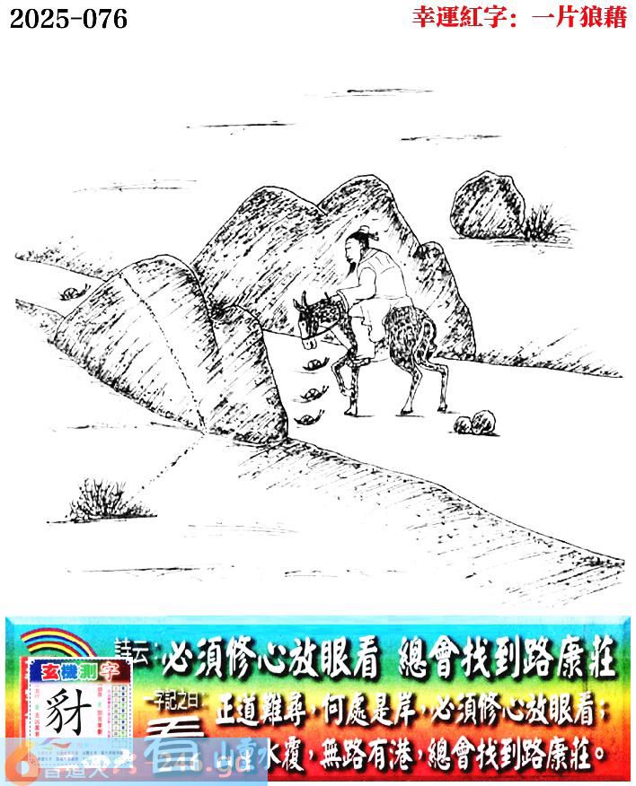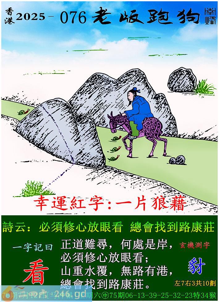 076期老版跑狗一字記之曰:【看】 詩雲:必須修心放眼看,總會找到路康莊。 正道難尋,何處是岸,必須修心放眼看; 山重水覆,無路有港,總會找到路康莊。 玄機測字:《豺》