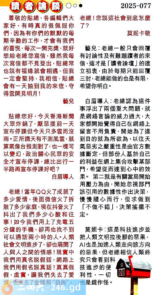 第零七七期讀者論談 1.尊敬的貼總,各編輯們大家好,有時真的很佩服你們,因為有你們的默默的每期辛勤的工作,才會有我們的喜悦,每次一開完獎,就好想給老總您寫信,雖然我每次寫信都不見登出,貼總常也說有福緣就會相遇,但我一定會堅持,我相信,貼總會有一天抽到我的來信,守得雲開見明月!藝兒 〖藝兒〗:老總一般只會回覆有討論性及有難題讀者的來信,這才是「讀者論壇」的建立初衷,由於每期只能回覆三封,老總能做的也是有限,希望你明白。 2.貼總您好,今天香港新聞大眾炸鍋了,厭惡提前一天宣布停課但今天只多雲而沒雨正所謂天有不測風雲,就算氣像台預測對了,也一樣可以變幻,政治關心民眾的安全才宣布停課,總比出行一半路再宣布停課好吧?白眉導人 〖白眉導人〗:老總認為這件事浮出了兩個重大問題,就是網絡言論的威力過大,大家都開始覺得自己在網絡上留言不用負責,開始為了達到目的就為所欲為,以往天氣惡劣之嚴重性是由官方數據断定,但部份人基於自己的利益在網上集合攻擊某部門,希望從而達到心中的效果。第二就是有關當局開始用壓力為由,開始忽視部門該引用的數據性作出決策,慢慢隨心而行,但求做到「不做不錯」,決策搖擺不 3.老總!當年火了成就了多少愛情,後面微信火了拆散了多少家庭,現在抖音火了抖出了我們多少心酸和往事!如今我們用上了充電五分鐘的手機,卻再也找不到可以通話兩小時的人人類社會文明進步了,卻也隔閡了人與人之間的情感!現實中我們用真名說假話,網路上我們用假名說真話!真真假假,虛實,讓我們失去了愛情,也失去了金錢和“自由”,老總!您說這社會到底怎麼了?莫妮卡敬 〖莫妮卡〗:這是科技進步並把人類文明拉後腳的惡果,也是加速人類走向該方向的惡果,但老總相信人類終究只會看到科技進步的便利性,一切也是錢作怪。