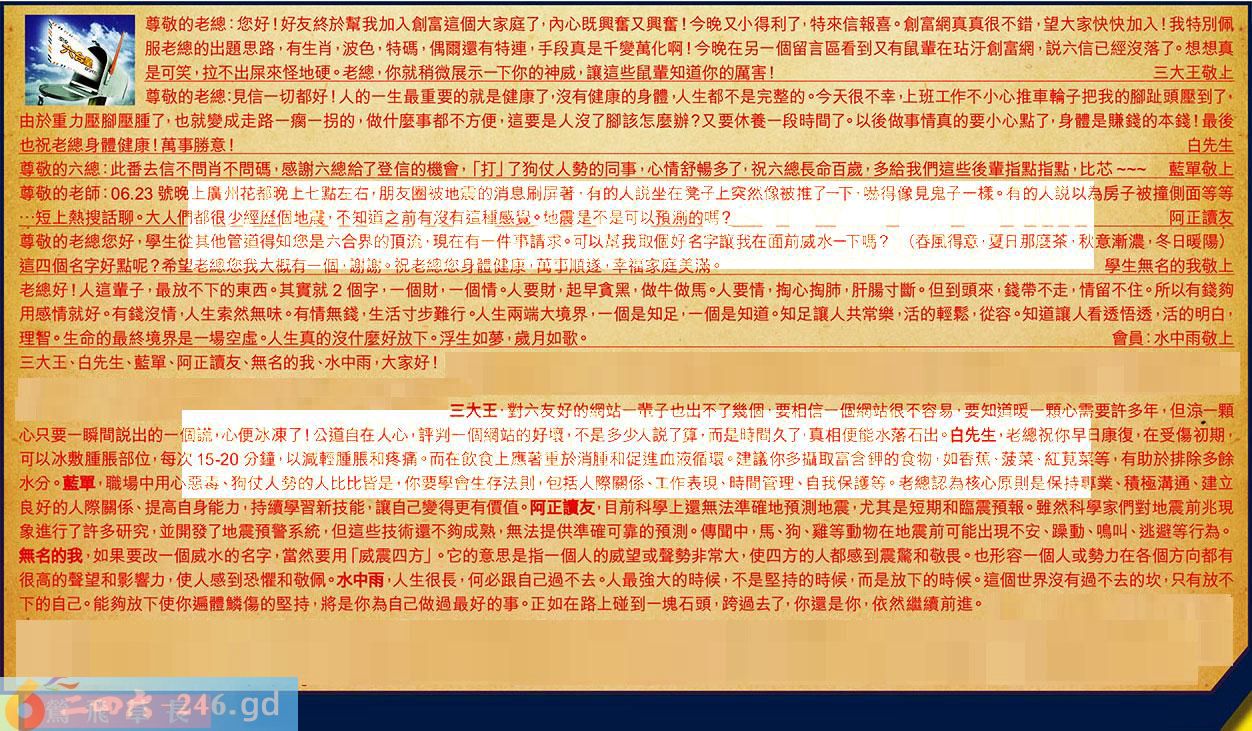 第077期《六合皇信箱文字版》10000%正確!!!正版二四六論壇*精心製作!!! 三大王、白先生、藍單、阿正讀友、無名的我、水中雨,大家好! 【1】.尊敬的老總:您好!好友終於幫我加入創富這個大家庭了,內心既興奮又興奮!今晚又小得利了,特來信報喜。創富網真真很不錯,望大家快快加入!我特別佩服老總的出題思路,有生肖,波色,特碼,偶爾還有特連,手段真是千變萬化啊!今晚在另一個留言區看到又有鼠輩在玷汙創富網,說六信已經沒落了。想想真是可笑,拉不出屎來怪地硬。老總,你就稍微展示下你的神威讓這些鼠輩知道你的厲害!三大王敬上 〖三大王〗:對六友好的網站一輩子也出不了幾個,要相信一個網站很不容易,要知道暖一顆心需要許多年,但涼一顆心只要瞬間說出的一個謊,心便冰凍了!公道自在人心,評判一個網站的好壞,不是多少人說了算,而是時間久了,真相便能水落石出。 【2】.尊敬的老總:見信一切都好!人的一生最重要的就是健康了,沒有健康的身體,人生都不是完整的。今天很不幸,上班工作不小心推車輪子把我的腳趾頭壓到了,由於重力壓腳壓腫了,也就變成走路一瘸一拐的,做什麼事都不方便,這要是人沒了腳該怎麼辦?又要休養一段時間了。以後做事情真的要小心點了,身體是賺錢的本錢!最後也祝老總身體健康!萬事勝意!白先生 〖白先生〗:老總祝你早日康復,在受傷初期,可以冰敷腫脹部位,每次15-20分鐘以減輕腫脹和疼痛。而在飲食上應著重於消腫和促進血液循環。建議你多攝取富含鉀的食物,如香蕉、菠菜、紅莧菜等,有助於排除多餘水分。 【3】.尊敬的六總:此番去信不問肖不問碼,感謝六總給了登信的機會,「打」了狗仗人勢的同事,心情舒暢多了,祝六總長命百歲,多給我們這些後輩指點指點,比芯藍單敬上 〖藍單〗:職場中用心惡毒、狗仗人勢的人比比皆是,你要學會生存法則,包括人際關係、工作表現、時間管理。自我保護等。老總認為核心原則是保持專業、積極溝通、建立良好的人際關係、提高自身能力,持續學習新技能,讓自己變得更有價值。 【4】.尊敬的老師:06.23號晚上廣州花都晚上七點左右,朋友圈被地震的消息刷屏著,有的人說坐在凳子上突然像被推了一下,嚇得像見鬼子一樣。有的人說以為房子被撞側面等等...短上熱搜話聊。大人們都很少經歷個地震,不知道之前有沒有這種感覺。地震是不是可以預測的嗎?阿正讀友 〖阿正讀友〗:目前科學上還無法準確地預測地震,尤其是短期和臨震預報。雖然科學家們對地震前兆現象進行了許多研究,並開發了地震預警系統,但這些技術還不夠成熟,無法提供準確可靠的預測。傳聞中,馬、狗、雞等動物在地震前可能出現不安、躁動、鳴叫、逃避等行為。 【5】.尊敬的老總您好,學生從其他管道得知您是六合界的頂流,現在有一件事請求。可以幫我取個好名字讓我在面前威水下嗎??(春風得意,夏日那麼茶,秋意漸濃,冬日暖陽)這四個名字好點呢?希望老總您我大概有一個,謝謝。祝老總您身體健康,萬事順遂,幸福家庭美滿。學生無名的我敬上 〖無名的我〗:如果要改一個威水的名字,當然要用「威震四方」。它的意思是指一個人的威望或聲勢非常大,使四方的人都感到震驚和敬畏。也形容一個人或勢力在各個方向都有很高的聲望和影響力,使人感到恐懼和敬佩。 【6】.老總好!人這輩子,最放不下的東西。其實就2個字,一個財,一個情。人要財,起早貪黑,做牛做馬。人要情,掏心掏肺,肝腸寸斷。但到頭來,錢帶不走,情留不住。所以有錢夠用感情就好。有錢沒情,人生索然無味。有情無錢,生活寸步難行。人生兩端大境界,一個是知足,一個是知道。知足讓人共常樂,活的輕鬆,從容。知道讓人看透悟透,活的明白,理智。生命的最終境界是一場空虛。人生真的沒什麼好放下。浮生如夢,歲月如歌。會員:水中雨敬上 〖水中雨〗:人生很長,何必跟自己過不去。人最強大的時候,不是堅持的時候,而是放下的時候。這個世界沒有過不去的坎,只有放不下的自己。能夠放下使你遍體鱗傷的堅持,將是你為自己做過最好的事。正如在路上碰到一塊石頭,跨過去了,你還是你,依然繼續前進。 紅字:鶯飛草長 暗码:06182946 [释义]形容明媚的春景。 [出处]南朝·梁·丘迟《与陈伯之书》:“暮春三月,江南草长,杂花生树,群莺乱飞。”