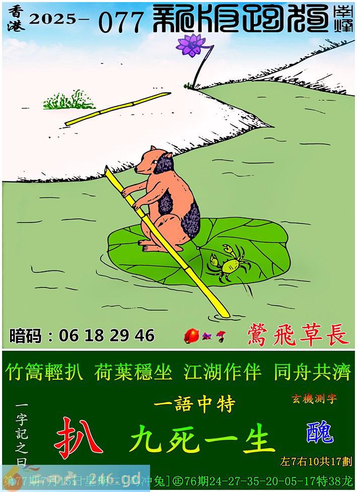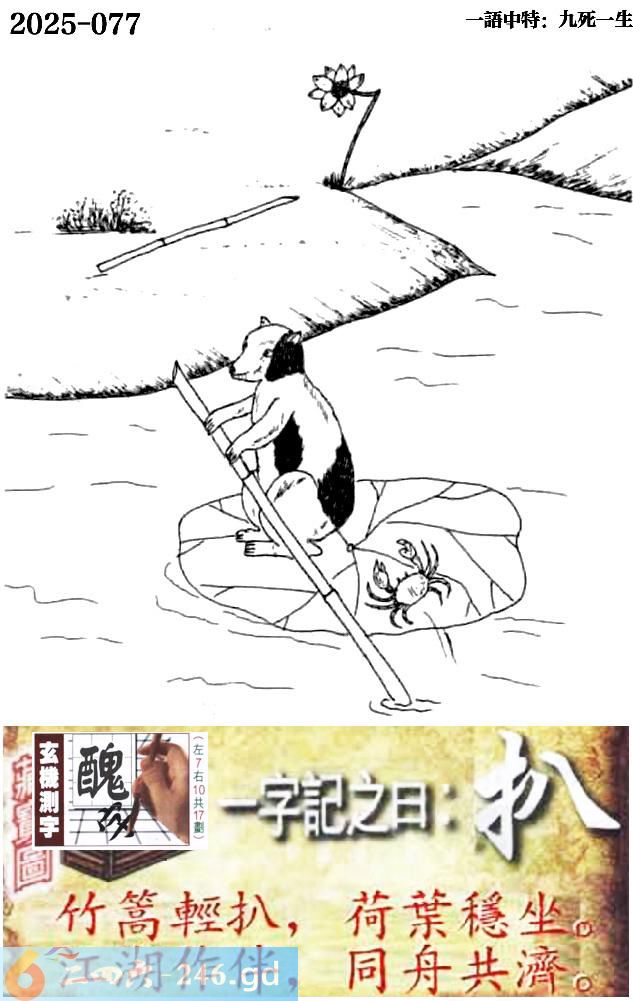 077期跑狗一字記之曰:【扒】 竹篙輕扒,荷葉穩坐。 江湖作伴,同舟共濟。 玄機測字:《醜》 一語中特:九死一生