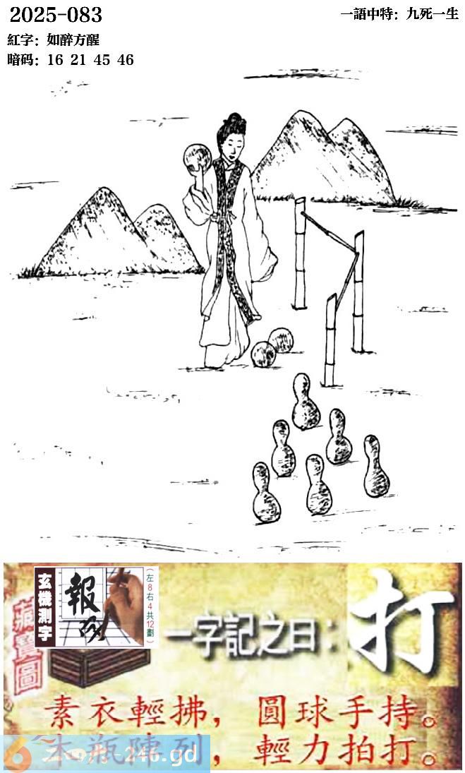 083期跑狗一字記之曰:【打】 素衣輕拂,圓球手持。 木瓶陣列,輕力拍打。 玄機測字:《報》 一語中特:九死一生