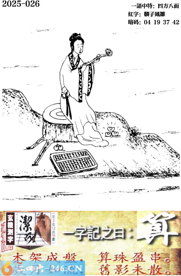 026期跑狗一字記之曰:【算】 木架成盤,算珠盈串。 歲月如流,舊影未散。 玄機測字:《潔》 一語中特:四方八面