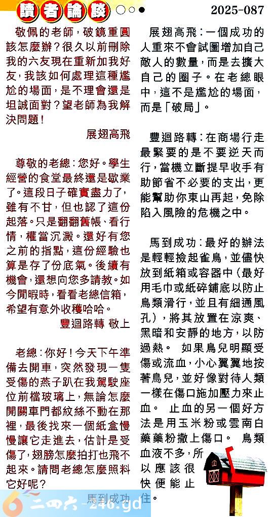 1.敬佩的老師,破鏡重圓該怎麼辦?很久以前刪除我的六友現在重新加我好友,我該如何處理這種尷尬的場面,是不理會還是坦誠面對?望老師為我解決問題!展翅高飛