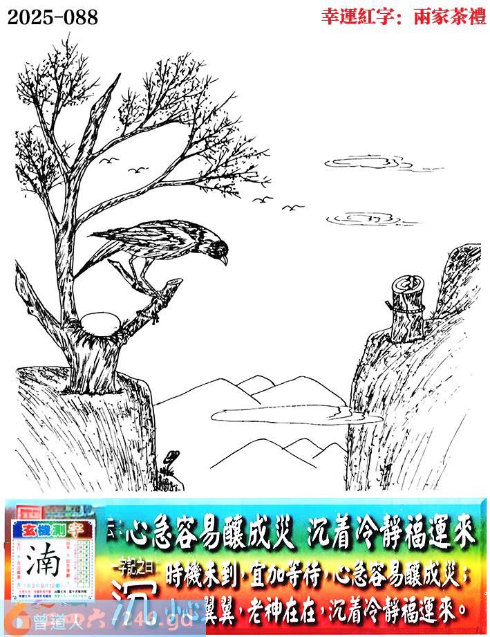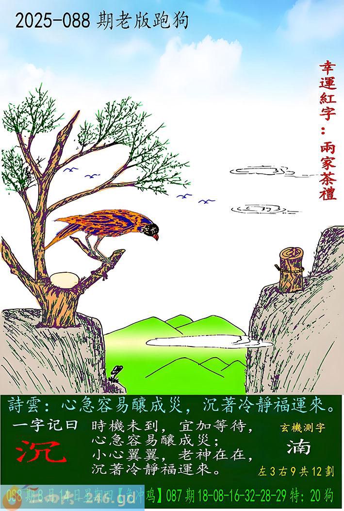 088期老版跑狗一字記之曰:【沉】 詩雲:心急容易釀成災,沉著冷靜福運來。
