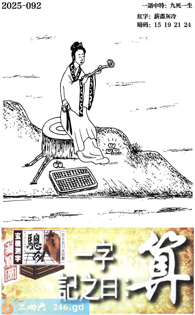 092期跑狗一字記之曰:【算】 如意緊握,算盤解愁。 動靜相兼,盈虧自知。 玄機測字:《驄》 一語中特:九死一生