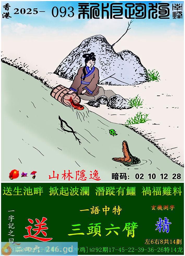 093期跑狗一字記之曰:【送】 送生池畔,掀起波瀾。 潛蹤有鱷,禍福難料。 玄機測字:《精》 一語中特:三頭六臂