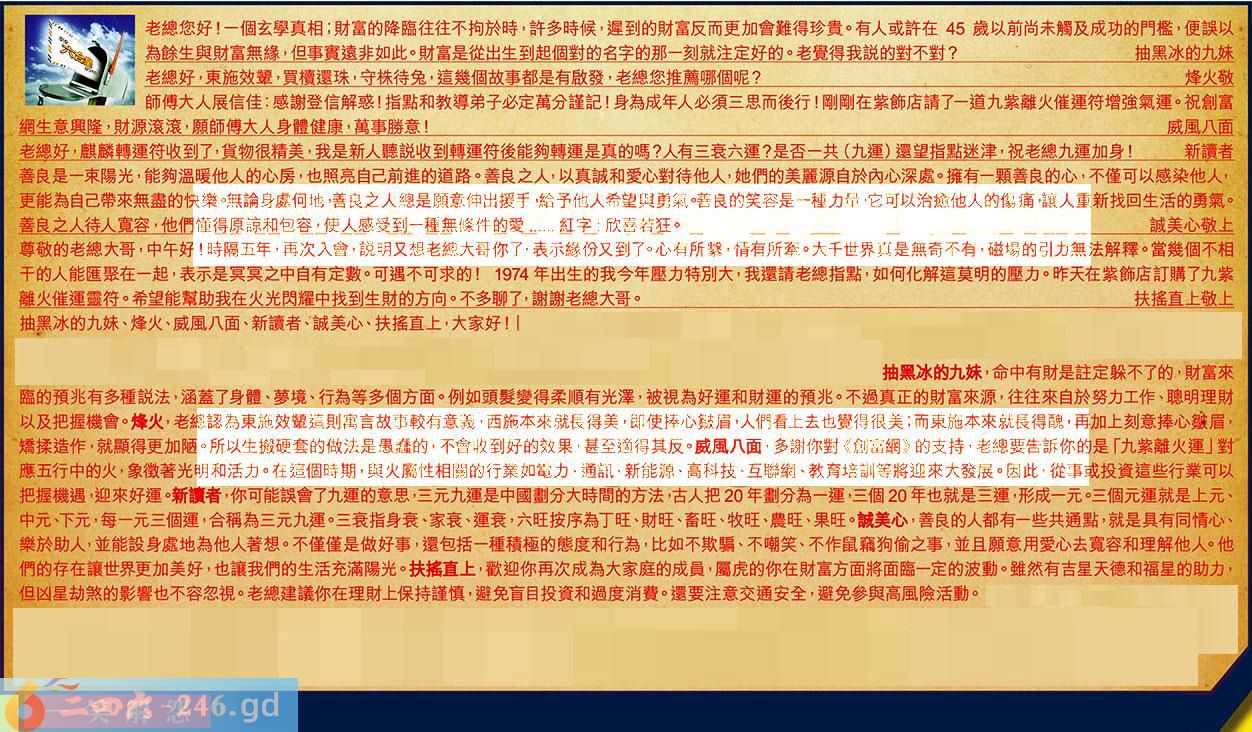 【6】.尊敬的老總大哥,中午好!時隔五年再次入會,說明又想老總大哥你了,表示緣份又到了。心有所繫,情有所牽。大千世界真是無賚不有,磁場的引力無法解釋。當幾個不相干的人能匯聚在一起,表示是冥冥之中自有定數。可遇不可求的!1974年出生的我今年壓力特別大,我還請老總指點,如何化解這莫明的壓力。昨天在紫飾店訂購了九紫離火催運靈符。希望能幫助我在火光閃耀中找到生財的方向。不多聊了,謝謝老總大哥。扶搖直上敬上