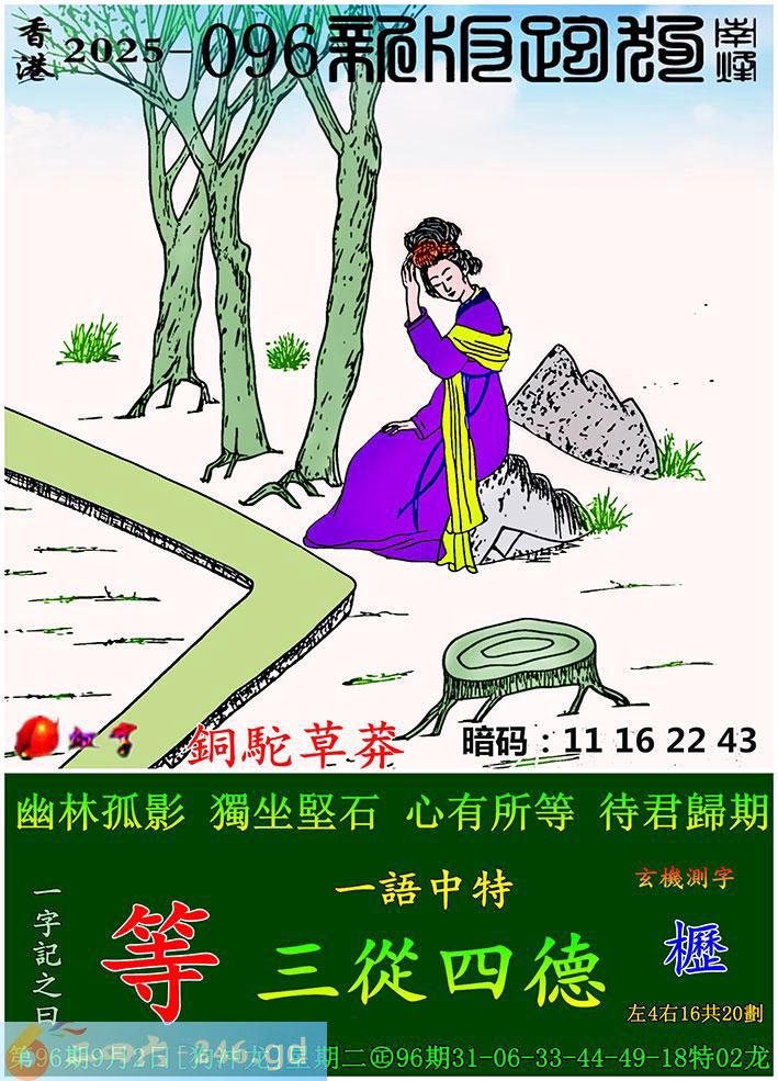 096期跑狗一字記之曰:【等】 幽林孤影,獨坐堅石。 心有所等,待君歸期。 玄機測字:《櫪》 一語中特:三從四德