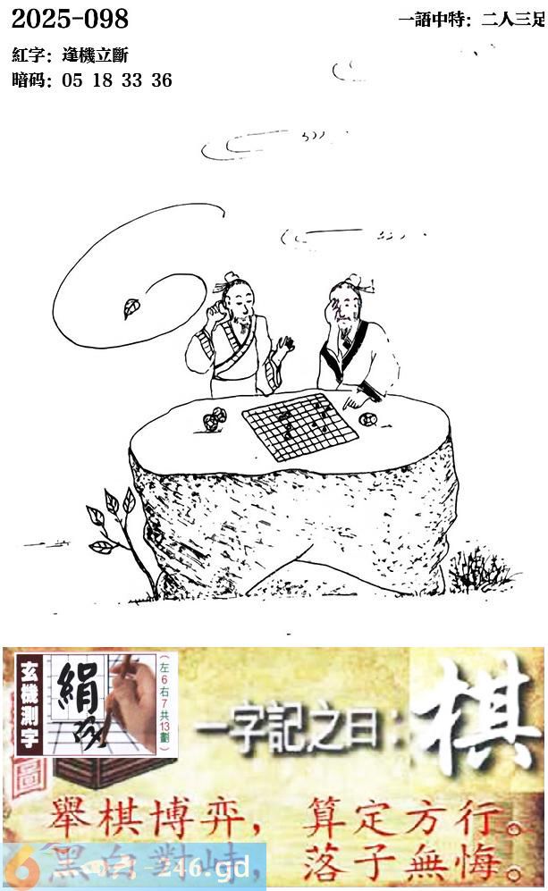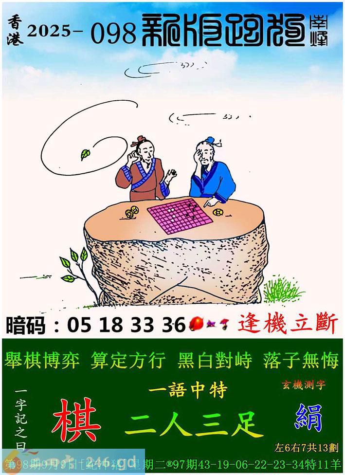 098期跑狗一字記之曰:【棋】 舉棋博弈,算定方行。 黑白對峙,落子無悔。 玄機測字:《絹》 一語中特:二人三足