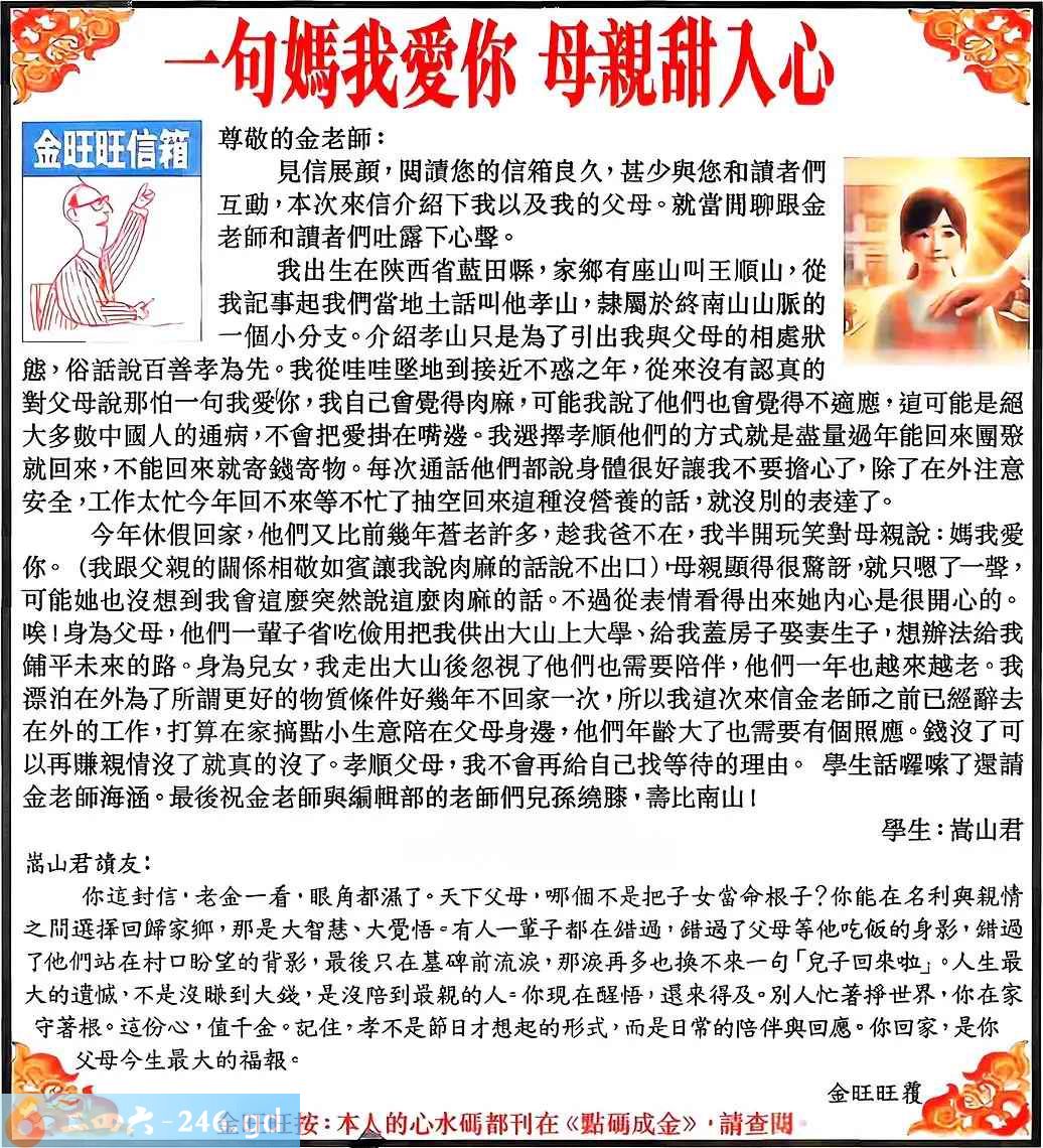 2025100期100期:金旺旺信箱彩民推荐→→《一句媽我愛你 母親甜入心》
