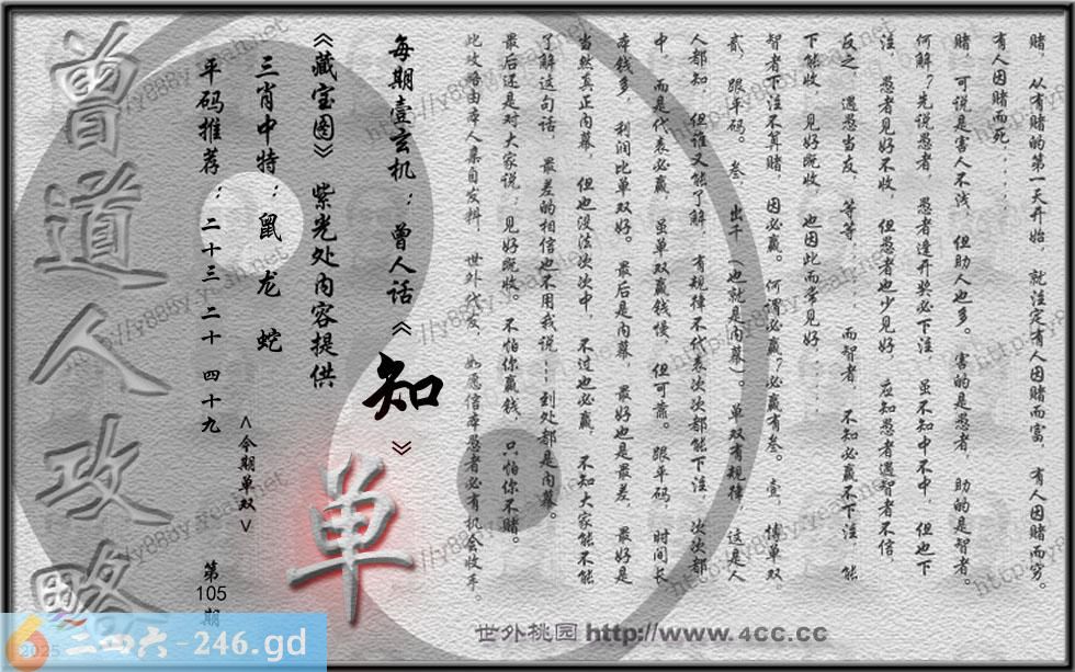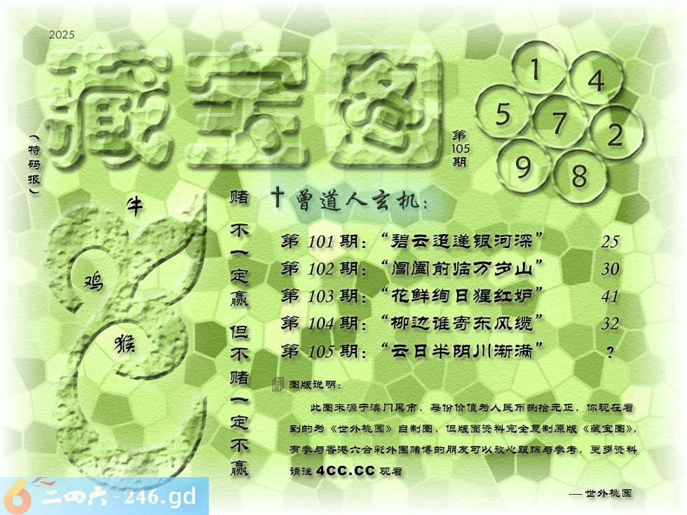 105期藏寶圖 新:云日半阴川渐满 老:忆君不见令人老 禁:兔 禁:6尾 玄機字:《知》