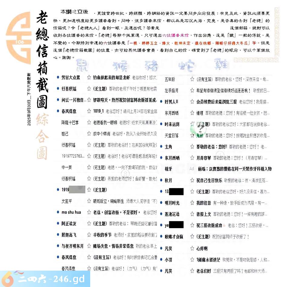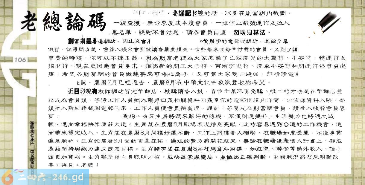 106期:六合皇金句/老总论码/萧公子/林大师/五行夺码/老总信箱截图