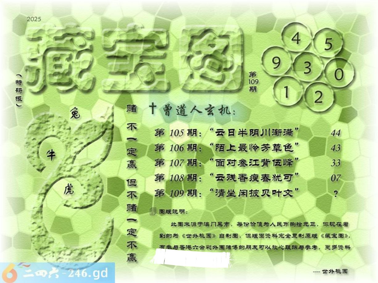 109期藏寶圖 新:清坐闲披贝叶文 老:寻到溪源壹线初 禁:龙 禁:6尾 玄機字:《收》
