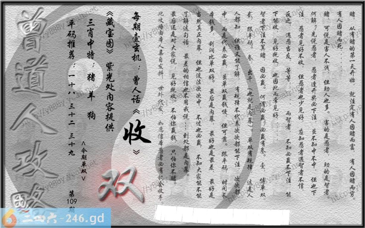 109期藏寶圖 新:清坐闲披贝叶文 老:寻到溪源壹线初 禁:龙禁:6尾玄機字:《收》