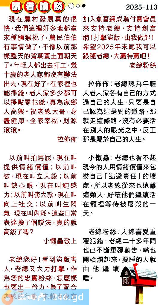 第一一三期讀者論談 1.現在農村發展真的很快,我們這裡好多地都拿來種獼猴桃了,農民伯伯有事情做了,不像以前那樣整天的背朝黃土面朝天了。年輕人都出去打工,幾十歲的老人家都沒有辦法出去,現在好了,在家裡也能掙錢,老人家多少都可以掙點零花錢,真為家鄉人高興。祝老總大哥,身體健康,全家幸福,財源滾滾。拉佈佈 〖拉佈佈〗:老總認為年輕人老人家各有自己的方式過自己的人生,只要是自己認為這是對的道路,那就走這條路。沒有必要活在別人的眼光之中,反正那是屬於自己的人生。 2.以前叫拍馬屁,現在叫提供情緒價值;以前叫裝,現在叫立人設;以前叫缺心眼,現在叫鈍感力;以前叫傍大款,現在叫向上社交;以前叫生悶氣,現在叫內耗。這些日常表達換了個說法,真的就高級了嗎?小懶蟲敬上 〖小懶蟲〗:老總也看不起現今的人用情緒價值來包装自己「逃避責任」的壞處,所以老總從來也遠離這類人,好讓他們繼續活在籠裡等待被屠殺的一天。 3.老總您好!看到盗版害人,老總又大力打擊,作為您的忠實粉絲,怎麼樣也要出一份力。為了配合老總的行動,末將也決定加入創富網成為付費會員來支持老總,支持創富網!打擊盗版,由我做起!希望2025年末尾我可以跟隨老總,大赢特赢吧!老總粉絲 〖老總粉絲〗:人總喜愛重覆犯錯,老總二十多年間也已不斷重覆勸告,嘴也開始爛起來,要睡的人就由他繼續睡。