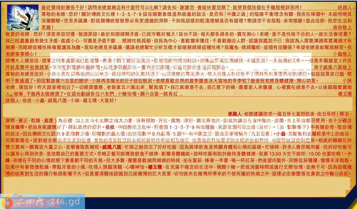 第115期《六合皇信箱文字版》10000%正確!!!正版二四六論壇*精心製作!!! 迷路人、依依、小蟲、威風八面、小妹、楊玉環,大家好! 【1】.最近覺得財運很不好!請問老總紫飾店有什麼符可以化解?請告知,謝謝您,會員快要到期了,我想買個放個在手機殼裡辟邪用!迷路人 〖迷路人〗:老總建議你求一道五帝七星符防身,由五帝符(順治、康熙、雍正、乾隆、嘉慶)為基礎,加上北斗七星陣之強大力量,擁有招財、升官擋煞、辟邪、鎮宅等功用,因此無論是在家中屋內、店面、車上等處都可使用,也十分適合隨身攜帶。把自身氣牆攪好了,運氣自然會提升。 【2】.尊敬的老總:您好!關於傳統文化裡1、3、5、7、9這些陽數象徵溫熱能量的說法,是否和「中庸之道」的陰陽平衡理念有關,我尚在琢磨中,未能明晰其深層關聯。您見多識廣,對這類傳統智慧想必有更透徹的洞察,不知我這樣的粗淺理解是否有道理?懇請您不吝指點,非常感謝!值此佳節,祝您生活和美麗!依依敬上 〖依依〗:中國傳統文化中,將奇數1、3、5、7、9叫做陽數,來源推測可能出自《易經》。《易.繫辭傳下》中有陽卦奇,陰卦偶的說法。因此傳統文化認為9是陽數之極,即陽數的最大值;由於陽數中9為最高,5居中,有中庸之意,因此皇帝被稱作「九五至尊」。 【3】.敬愛的老總:您好!深夜來信叨擾,敬請原諒!最近和媳婦鬧矛盾,已經冷戰好幾天!話也不說,每天都各過各的,實在揪心!老總,是不是性格不合的人一起生活會很累?我已經盡量避免發生矛盾,處處小心,可還是矛盾不斷...媳婦性格孤僻,自我為中心,喜歡獨來獨往,不喜歡融合人群,這讓我尷尬不已;我認為人需要溝通需要溝通才有樂趣,而媳婦這種性格確實讓我為難。我知老總見多識廣,還請老總幫忙分析怎樣才能破解媳婦這種性格?我屬兔,媳婦屬蛇,這個有沒關係?希望老總是能幫我解答。祝老總事事順心!小蟲敬上 〖小蟲〗:男屬兔和女屬蛇是中上的組合,但需要磨合。這對組合都追求完美與優雅,男兔的善良智慧與女蛇的聰明伶俐能相互吸引,但男兔的熱情要求與女蛇的挑剔矜持,可能導致誤會與僵局。相處的關鍵在於雙方要有一顆寬容大量之心,並學會取長補短。 【4】.師傅大人展信佳,提筆之時寒露節氣已近尾聲。然弟子剛下班還沒洗澡。就怕錯過問候的時間。願寒露節氣安康順遂,幸福美滿!一天做兩份工作。十份是本職飯堂工作另外就是整件批發蔬菜。常常忙到錯過吃飯時間。最近多數都是吃一餐也不覺得餓。這樣忙碌的生活還挺開心。弟子威風八面敬上 〖威風八面〗:忙碌之餘別忘了好好吃飯,因為規律飲食是照顧身體和心情的基礎。忙碌時,許多人會忽略用餐,但好好吃飯可以讓身心得到休息,是放鬆自己的重要方式。忽略正餐可能導致飲食不規律,影響身體機能。按時吃飯有助於維持身體健康,就算13:00太忙不能吃,15:00也要吃啊!。 【5】.尊敬的老總見信好,小妹生長在這偏僻的山區地方,這段時間的天氣轉涼了,山區夜晚的寒風真大,吹入骨讓人有些受不了顫抖而有東歪西倒的感覺。俗話說黑夜已臨,黎明不會遙遠了。相信緊跟著六合皇的腳步,小妹再見陽光的日子就在眼前。老總喜歡炎熱的夏季還是冰天雪地的冬季呢?最後祝老總身體健康,開心如意。小妹 〖小妹〗:老總在不同的心情狀態下會喜歡不同的天氣。但大多數,還蠻喜歡細雨綿綿的時候,坐在窗前,捧著一本書,喝一杯紅茶,然後望向窗外,回憶從前種種,憧憬未來點點。空氣中有著微微乾燥,帶點冷意的小風,吹得人頭腦清醒,心曠神怡。 【6】.老總展信好!昨天跟家裡坦白了一切網貸債務,老爸拿五六萬出來,幫我填了。自己真過意不去,自己惹下的禍,還要家人來償還,心裡實在過意不去。以後踏踏實實做人。做事,不敢再去碰網貸了。在這也勸誡各位六友們,小賭怡情。願六合皇一路長紅...楊玉環 〖楊玉環〗:在充滿不確定的生活中,偶爾小賭一把或消磨時間或進行交際怡情,並無不可,因為這樣賭博的結果對生活的運行軌跡影響不大。但是要清醒地認識到沉迷賭博的巨大危害,切勿迷失在賭博所帶來的不勞而獲的快感之中,這樣必定會墮落在貪欲之中難以自拔。 紅字:詞窮理虧 暗码:06151921 [释义]理由正确充分,说话就有气势,理由站不住脚,就无话可说。 [出处]《玉燕姻缘全传》六一:皇上午门外有一座冤鼓楼,楼下有多少御林军把守,你却不可害怕。自古道:理直气壮,词穷理亏。看人的来意虚实。