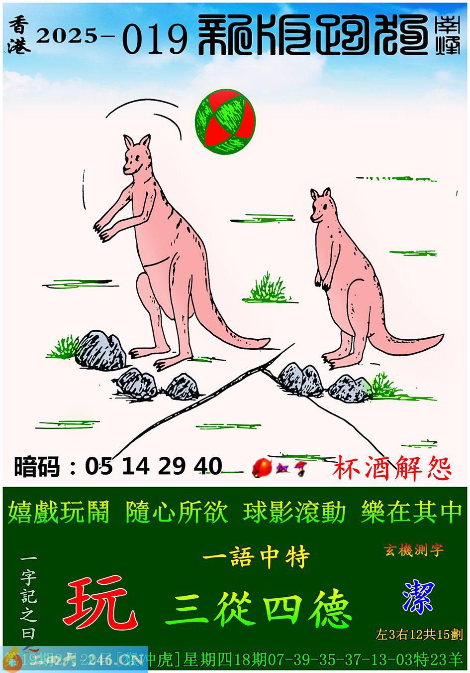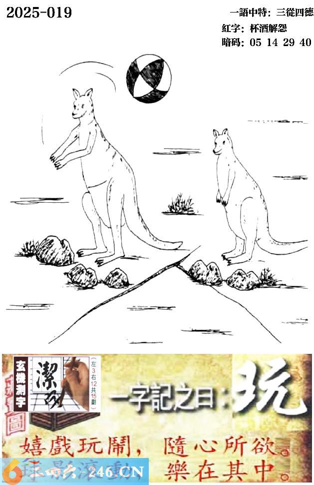 019期跑狗一字記之曰:【玩】 嬉戲玩鬧,隨心所欲。 球影滾動,樂在其中。 玄機測字:《潔》 一語中特:三從四德