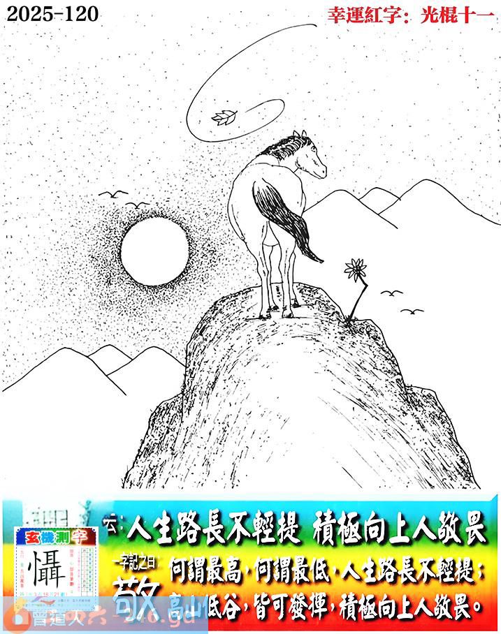 120期老版跑狗一字記之曰:【敬】 詩雲:人生路長不輕提,積極向上人敬畏。 何謂最高,何謂最低,人生路長不輕提; 高山低谷,皆可發揮,積極向上人敬畏。 玄機測字:《懾》