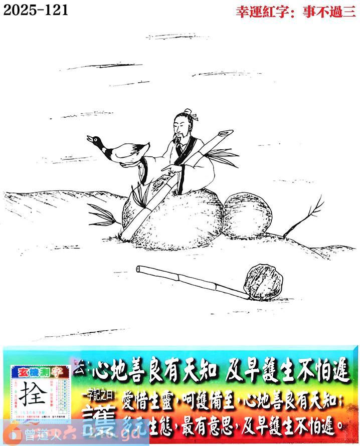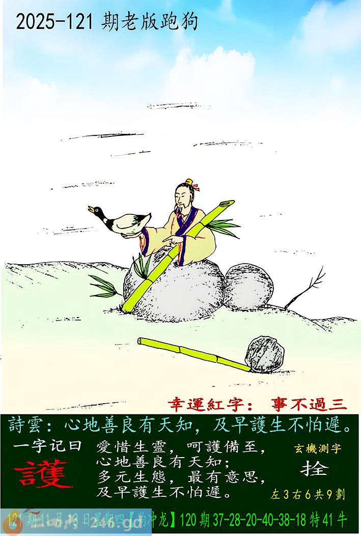 121期老版跑狗一字記之曰:【護】 詩雲:心地善良有天知,及早護生不怕遲。