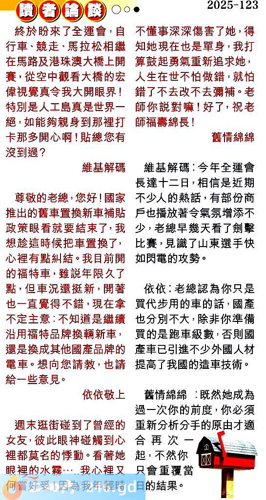 第一二三期讀者論談 1.終於盼來了全運會,自行車、競走、馬拉松相繼在馬路及港珠澳大橋上開賽,從空中觀看大橋的宏偉視覺真令我大開眼界!特別是人工島真是世界一絕,如能夠親身到那裡打卡那多開心啊!貼總您有沒到過?維基解碼 〖維基解碼〗:今年全運會長達十二日,相信是近期不少人的熱話,有部份商戶也播放著令氣氛增添不少,老總早幾天看了劍擊比赛,見識了山東選手快如閃電的攻勢。 2.尊敬的老總,您好!國家推出的舊車置換新車補貼政策眼看就要結束了,我想趁這時候把車置換了心裡有點糾結。我目前開的福特車,雖說年限久了點,但車況還挺新,開著也一直覺得不錯,現在拿不定主意:不知道是繼續沿用福特品牌換輛新車,還是換成其他國產品牌的電車。想向您請教,也請給一些意見。依依敬上 〖依依〗:老總認為你只是買代步用的車的話,國產也分別不大,除非你準備買的是跑車級數,否則國產車已引進不少外國人材提高了我國的造車技術。 3.週末逛街碰到了曾經的女友,彼此眼神碰觸到心裡都莫名的悸動。看著她眼裡的水...我心裡又何嘗好受!因為我年輕時个懂事深深傷害了她,得知她現在也是單身,我打算鼓起勇氣重新追求她,人生在世不怕做錯,就怕錯了不去改不去彌補。老師你說對嘛!好了,祝老師福壽綿長!舊情綿綿 〖舊情綿綿〗:既然她成為過一次你的前度,你必須重新分析分手的原由才適合再次一起,不然你只會重覆當日的結果。