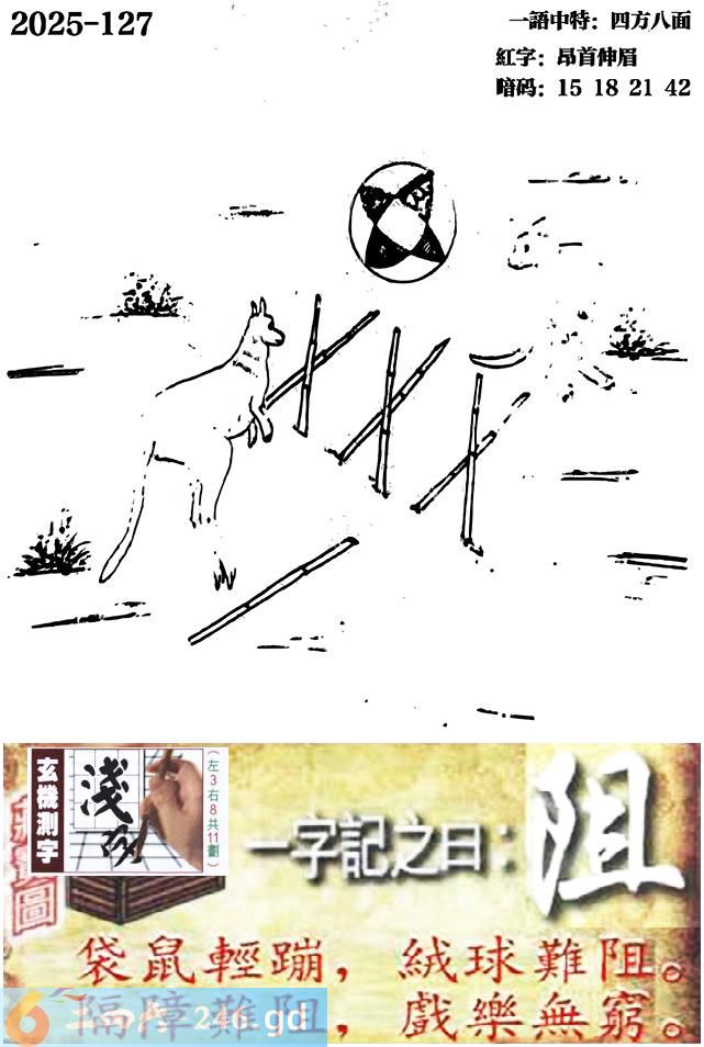 127期跑狗一字記之曰:【阻】 袋鼠輕蹦,絨球難阻。 隔障難阻,戲樂無窮。 玄機測字:《淺》 一語中特:四方八面