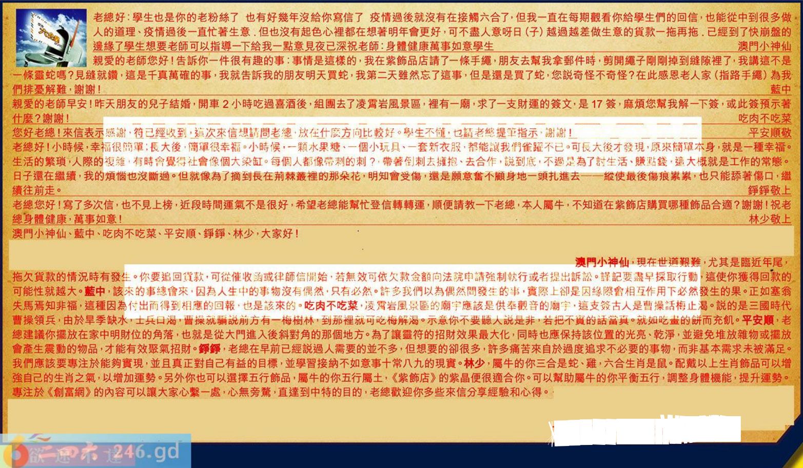 【1】.老總好:學生也是你的老粉絲了也有好幾年沒給你寫信了疫情過後就沒有在接觸六合了,但我一直在每期觀看你給學生們的回信,也能從中到很多做人的道理、疫情過後一直忙著生意.但也沒有起色心裡都在想著明年會更好,可不盡人意呀日(子)越過越差做生意的貨款一拖再拖.已經到了快崩盤的邊緣了學生想要老師可以指導一下給我一點意見夜已深祝老師:身體健康萬事如意學生澳門小神仙
