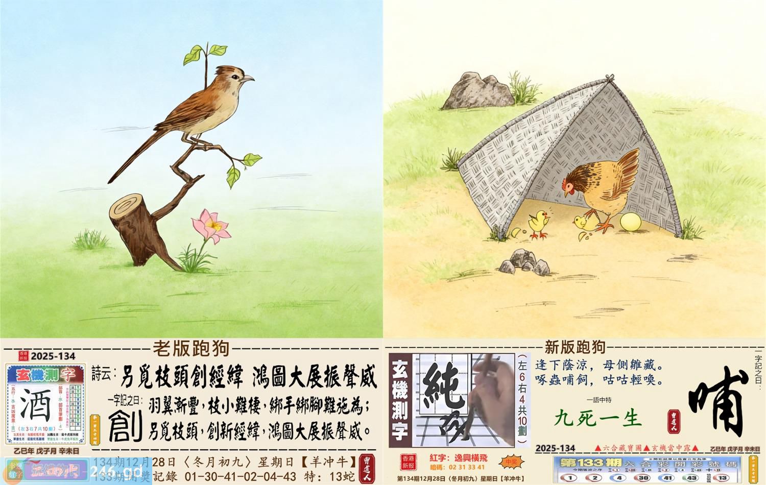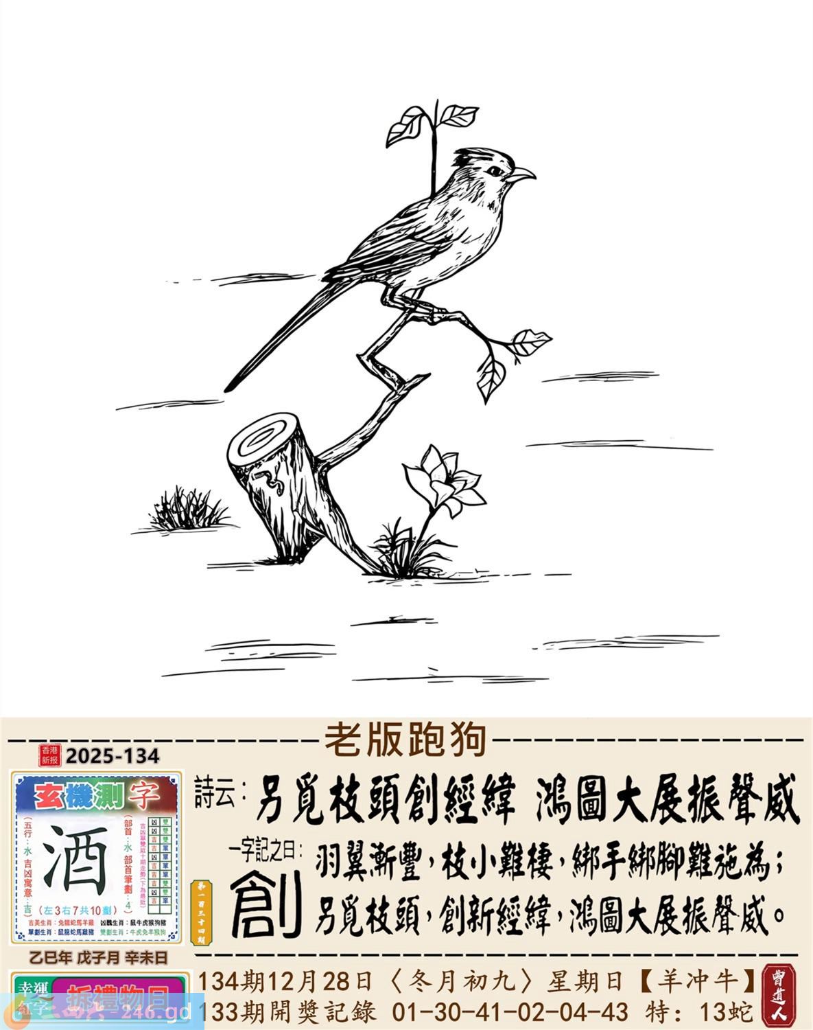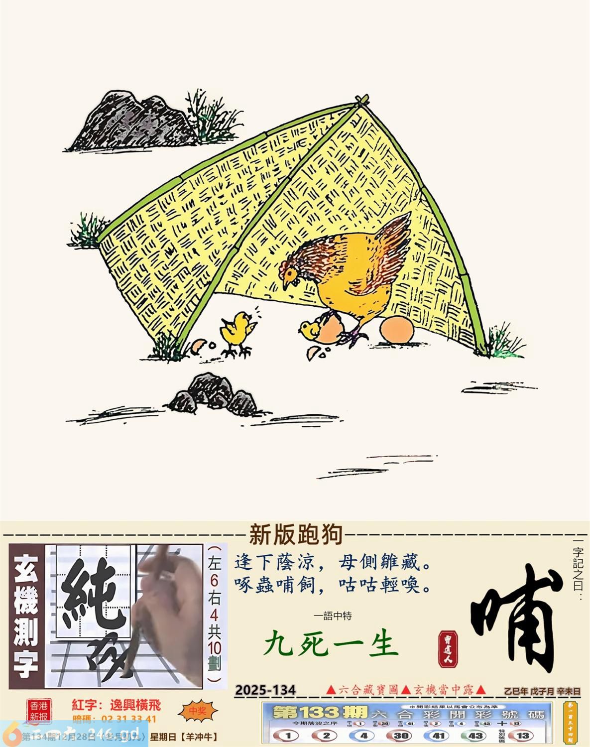 2025年12月28日134期牛(乙丑)(路旁土) 134期:老版跑狗玄機一字記之曰:【創】 詩云:另覓枝頭創經緯鴻圖大展振聲威 羽翼漸豐,枝小難棲,綁手綁腳難施為; 另覓枝頭,創新經緯,鴻圖大展振聲威。 玄機測字:《酒》 134期:信箱紅字:【逸興橫飛】 134期:【暗碼:02-31-33-41】 134期:一語中特:【九死一生】 密圖詩:時未運轉九十圈 《記》:生個兒子叫小寶 特碼大小單雙句:五杯水酒敬兄長 今期必中:趙雲 134期:特碼歇后語 年三十夜拨算盘-----满打满算 134期正版四字梅花诗:浴火重生。 134期火车头:烧伤猪。诗:鼠死龙伤,单二加九更出来。 134期香港第一手欲钱料:十指连心。 134期曾道人说:“三脚架?” 134期另版四字梅花诗:国际形象。 134期香港第一手欲钱料:欲钱看白天见不到的动物。 134期曾道人说:“男人三十工作时最爱做哪件事”? 134期:二字經:去世 134期:婊子是特码 134期:智力金壤:鹏程万里 134期:信箱紅字:【逸興橫飛】 134期:【暗碼:02-31-33-41】 134期:一語中特:【九死一生】 玄機發財圖:圖中明豬紅藍 134期:藏寳圖 新:彩川紫岫洗诗愁 老:自许高材老更刚 禁:狗禁:3尾玄机字《穿》 2025年134期【生活幽默】版 〖山間小路〗 長期住在城市的張三,一天回鄉下探親,在山間小路開車,正當他悠哉欣赏美麗風景時,突然迎面開來的貨車司機摇下窗户大喊一聲:"猪!" 張三愣了一下,越想越氣,也摇下車窗大:"你才是猪!" 剛完,他便迎頭撞上一群過馬路的猪。