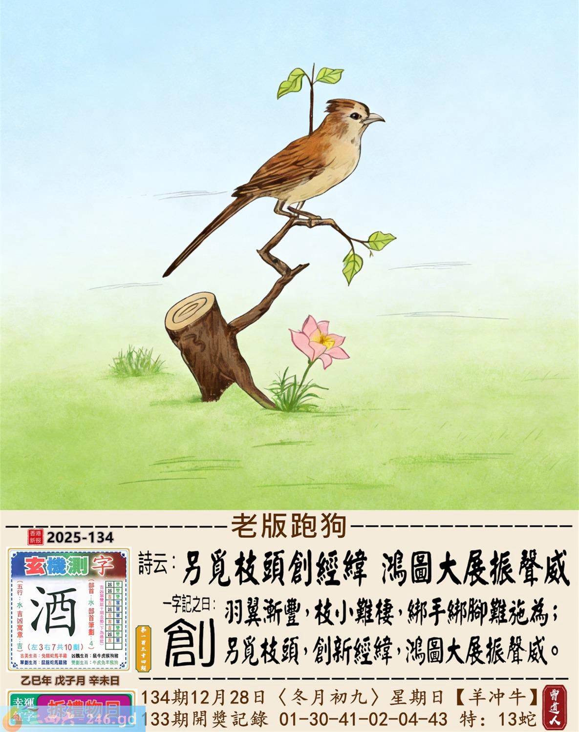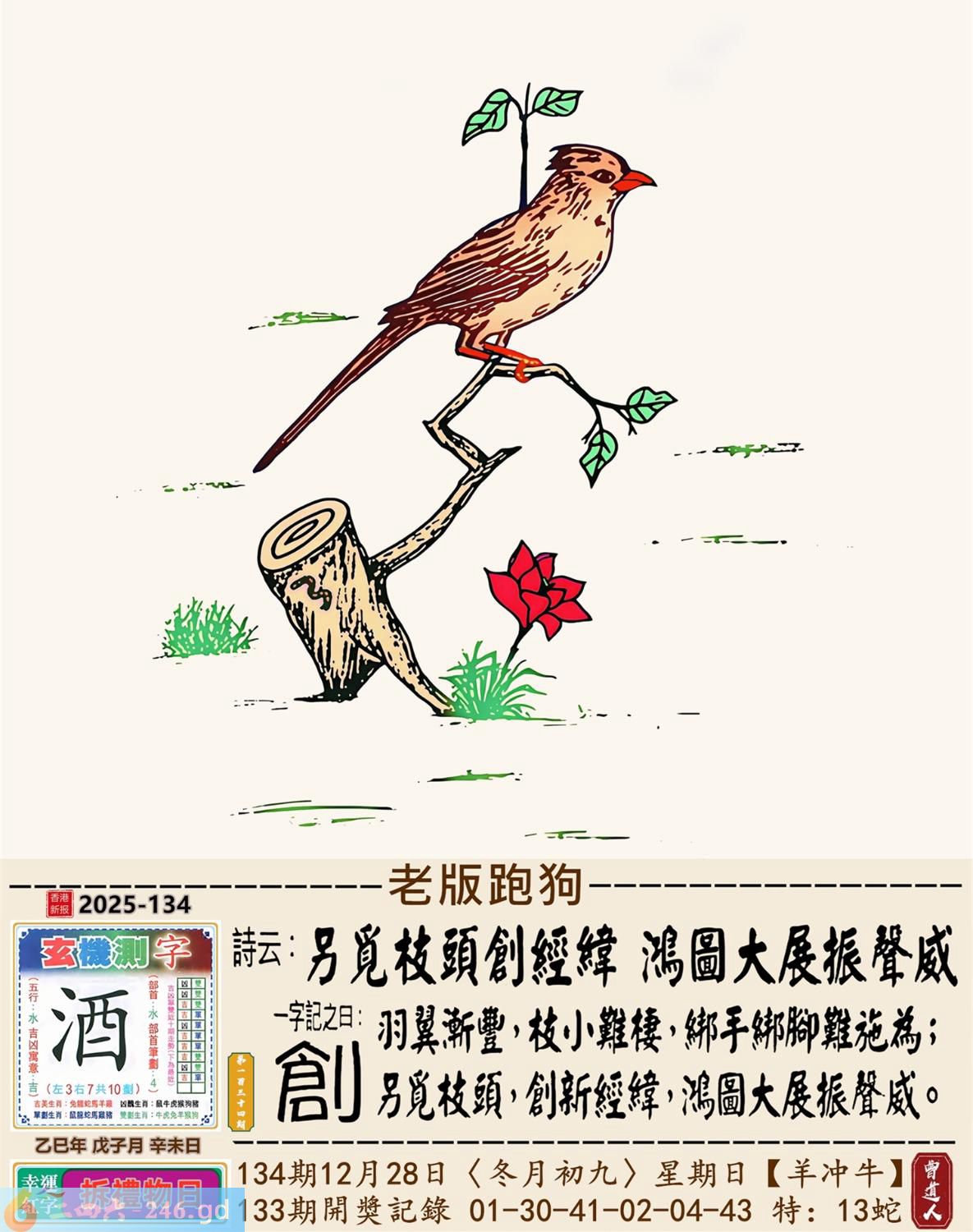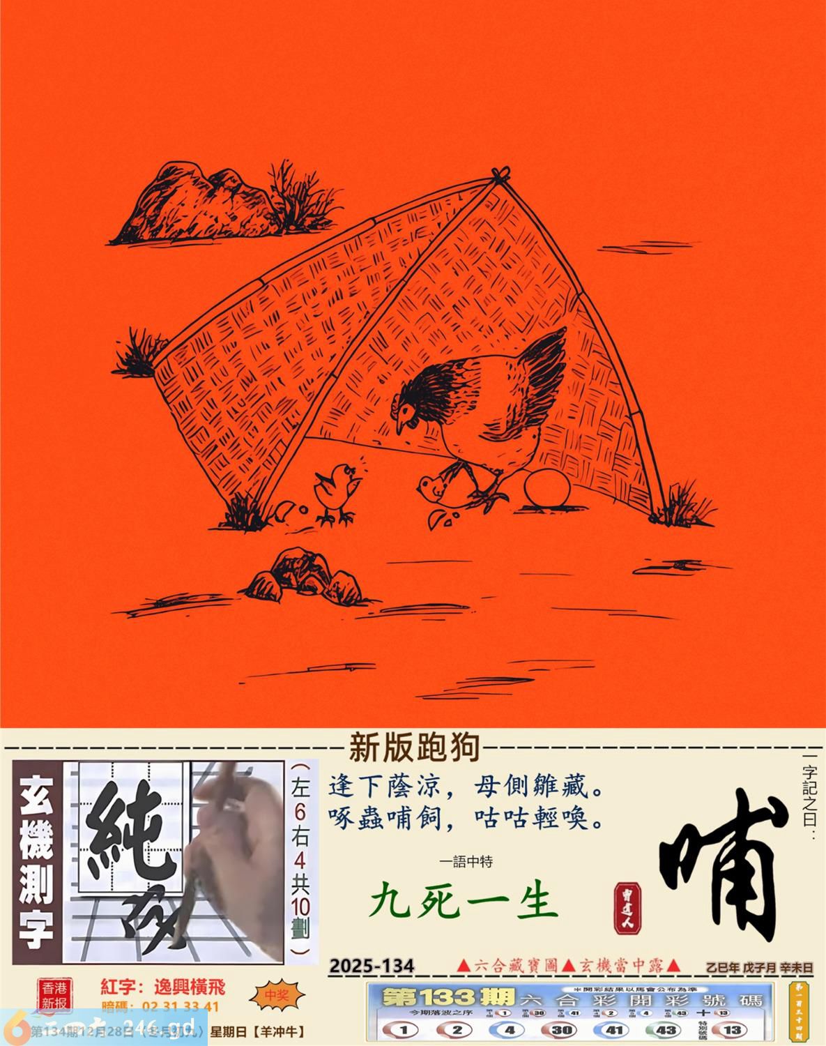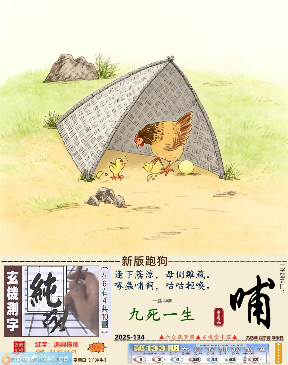 2025年12月28日134期牛(乙丑)(路旁土) 134期:老版跑狗玄機一字記之曰:【創】 詩云:另覓枝頭創經緯鴻圖大展振聲威 羽翼漸豐,枝小難棲,綁手綁腳難施為; 另覓枝頭,創新經緯,鴻圖大展振聲威。 玄機測字:《酒》 134期:信箱紅字:【逸興橫飛】 134期:【暗碼:02-31-33-41】 134期:一語中特:【九死一生】 密圖詩:時未運轉九十圈 《記》:生個兒子叫小寶 特碼大小單雙句:五杯水酒敬兄長 今期必中:趙雲 134期:特碼歇后語 年三十夜拨算盘-----满打满算 134期正版四字梅花诗:浴火重生。 134期火车头:烧伤猪。诗:鼠死龙伤,单二加九更出来。 134期香港第一手欲钱料:十指连心。 134期曾道人说:“三脚架?” 134期另版四字梅花诗:国际形象。 134期香港第一手欲钱料:欲钱看白天见不到的动物。 134期曾道人说:“男人三十工作时最爱做哪件事”? 134期:二字經:去世 134期:婊子是特码 134期:智力金壤:鹏程万里 134期:信箱紅字:【逸興橫飛】 134期:【暗碼:02-31-33-41】 134期:一語中特:【九死一生】 玄機發財圖:圖中明豬紅藍 134期:藏寳圖 新:彩川紫岫洗诗愁 老:自许高材老更刚 禁:狗禁:3尾玄机字《穿》 2025年134期【生活幽默】版 〖山間小路〗 長期住在城市的張三,一天回鄉下探親,在山間小路開車,正當他悠哉欣赏美麗風景時,突然迎面開來的貨車司機摇下窗户大喊一聲:"猪!" 張三愣了一下,越想越氣,也摇下車窗大:"你才是猪!" 剛完,他便迎頭撞上一群過馬路的猪。