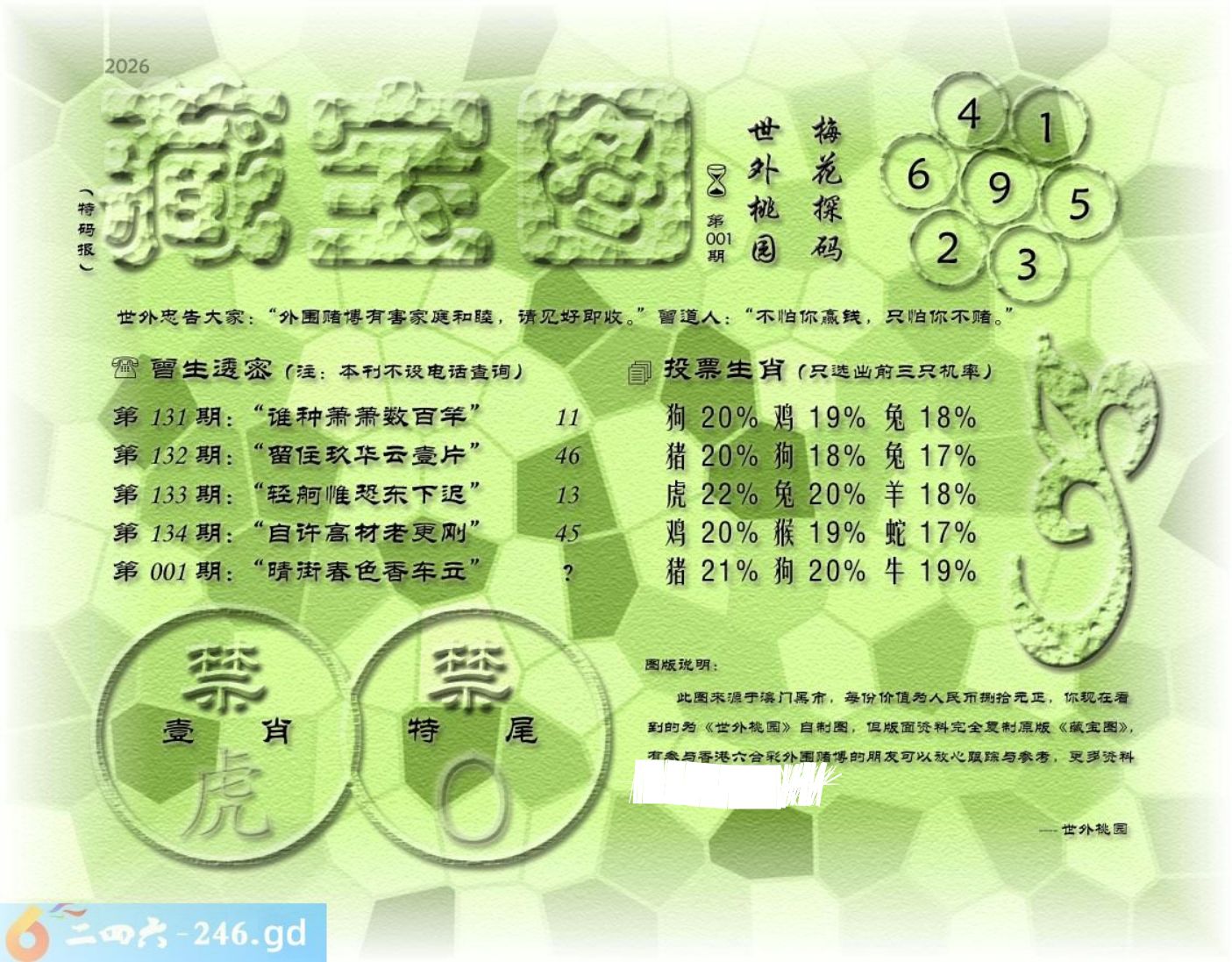 001期藏寶圖 新:郊外黄垓端可厌 老:晴街春色香车立 禁:虎 禁:0尾 玄機字:《育》