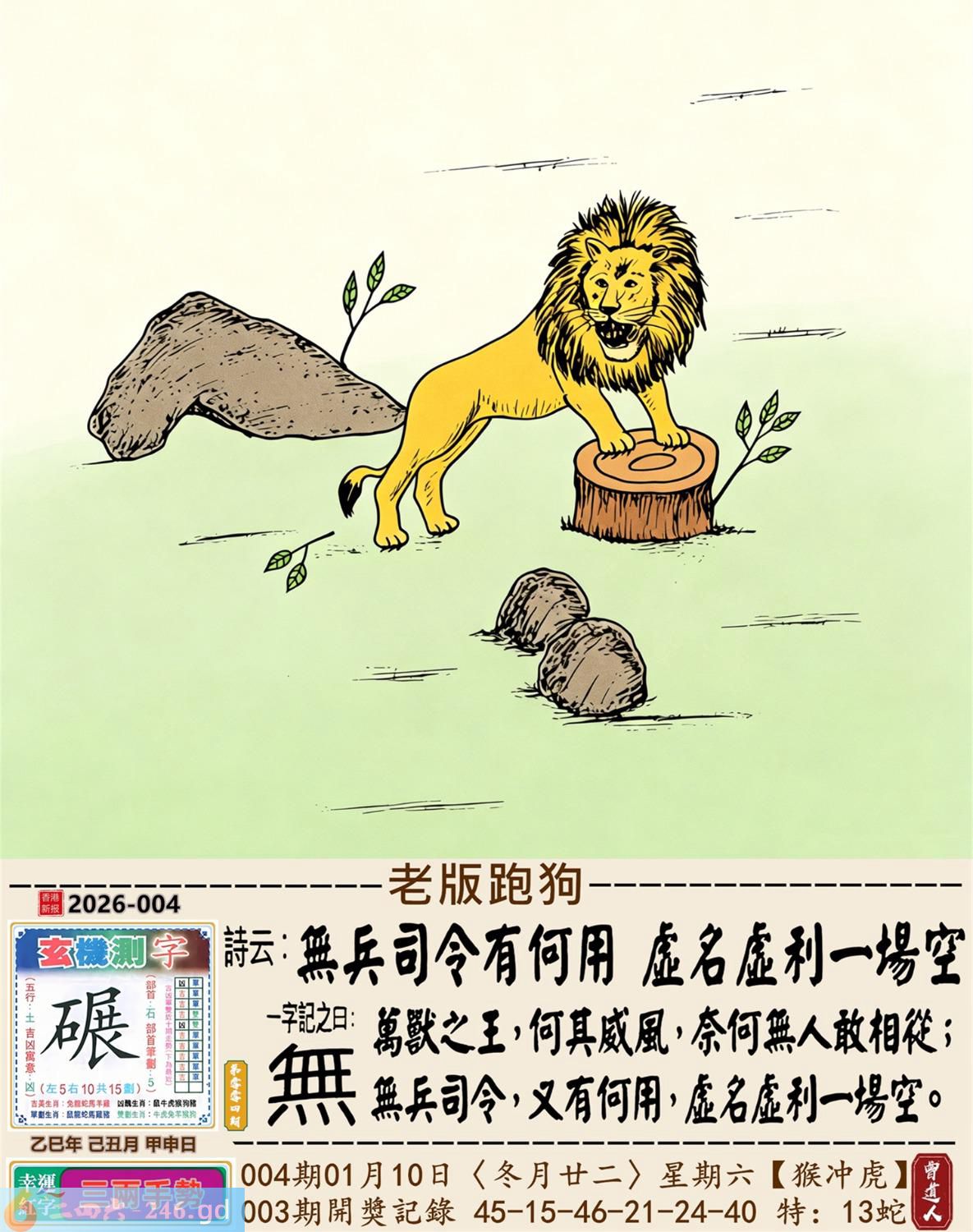 2026年1月10日004期虎(戊寅)(泉中水) 004期:老版跑狗玄機一字記之曰:【無】 詩云:無兵司令有何用虛名虛利一場空 萬獸之王,何其威風,奈何無人敢相從; 無兵司令,又有何用,虛名虛利一場空。 玄機測字:《碾》 密圖詩:一對核桃一對棗 《記》:試看中有玉兔 特碼大小單雙句:伸手要錢 今期必中:黄月英 004期:特碼歇后語 葵花的盘子-----老转向 004期正版四字梅花诗:涉险过关。 004期火车头:烧伤马。诗:羊死龙伤,四书五经读一生。 004期香港第一手欲钱料:一。 004期曾道人说:“人?” 004期另版四字梅花诗:七十二变。 004期香港第一手欲钱料:欲钱找世界最高楼。 004期曾道人说:“为什么现代的人喜欢赌博”? 004期:二字經:帶頭 004期:白头翁是特码 004期:智力金壤:春和景明 004期:信箱紅字:【獨占鰲頭】 004期:【暗碼:01-25-37-49】 004期:一語中特:【二八佳人】 發財玄機圖:伺機而動狡猾敏捷圖中明蛇鼠藍綠 004期:藏寳圖 新:天教谪入群花苑 老:乌蒙磅礴走泥丸 禁:狗禁:1尾玄机字《收》 2026年004期【生活幽默】版 〖精神病院〗 一精神病院裏,院長想看看他的病人到了什程度,就在他們面前放了一祗兔子。 第一個病人上去:"駕!駕!駕!" 第二個病人:"駕,快去追他!"院長無奈地嘆了口氣。 此時,院長看見第三個病人在那一直摸那衹兔子,滿意地點了點頭。没想到那個病人却説: "小樣,先讓你們300米,等我擦完車再説。"