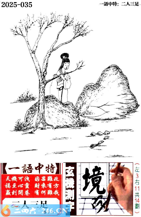 035期跑狗一字記之曰:【守】 庭院殘花,佳人獨守。 風撫繡衣,添加寂寞。 玄機測字:《境》 一語中特:二人三足