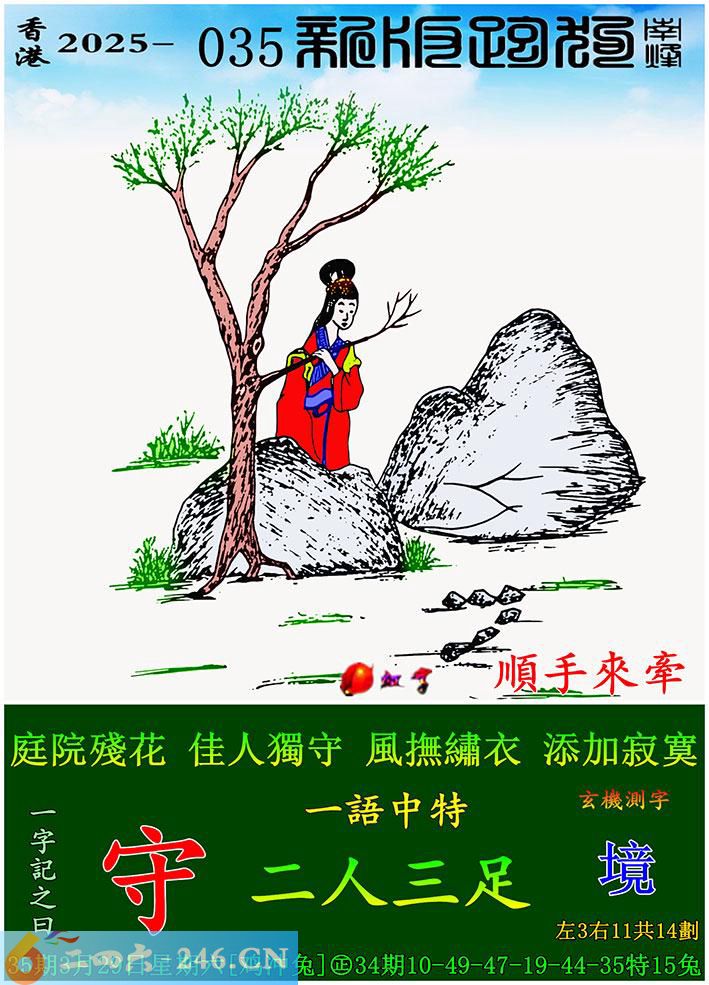 2025035期035期跑狗一字記之曰:【守】 庭院殘花,佳人獨守。 風撫綉衣,添加寂寞。