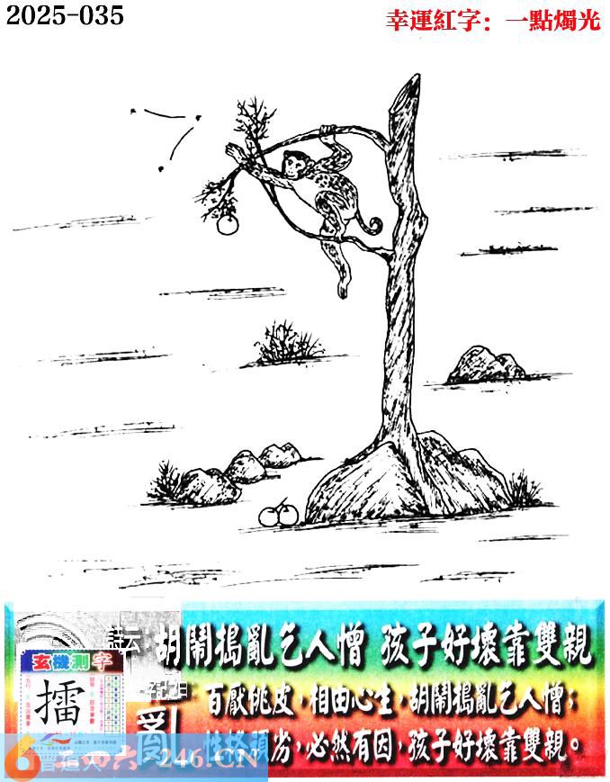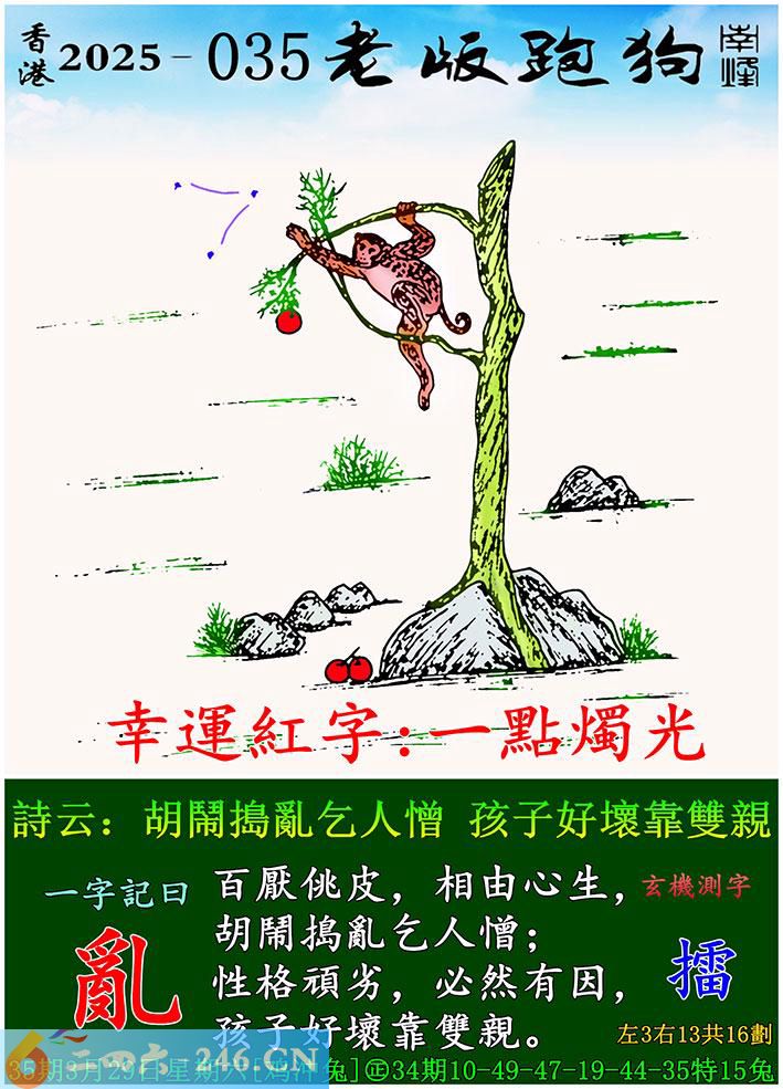 035期老版跑狗一字記之曰:【亂】 詩雲:胡鬧搗亂乞人憎,孩子好壞靠雙親。