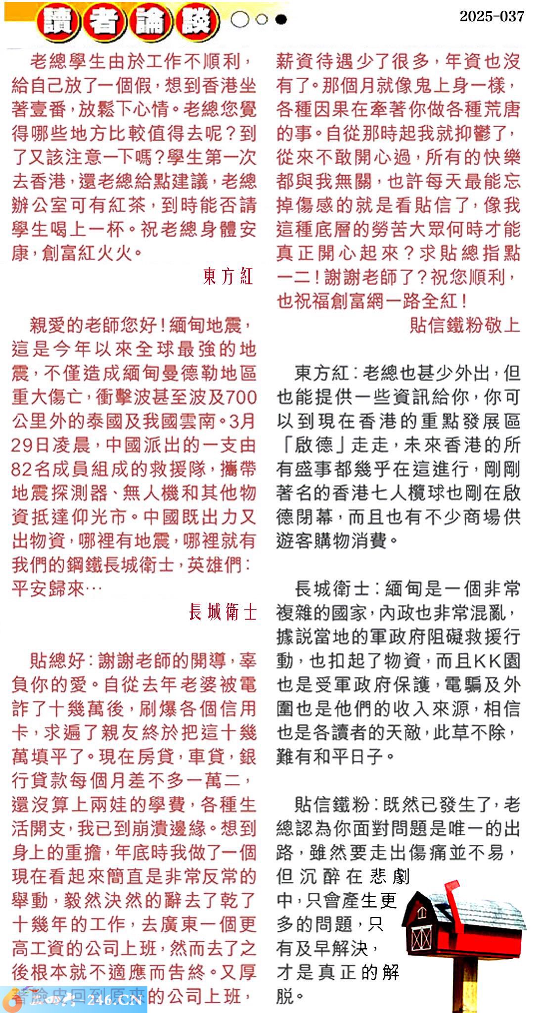 第零三七期讀者論談 1.老總學生由於工作不順利,給自己放了一個假,想到香港坐著壹番,放鬆下心情。老總您覺得哪些地方比較值得去呢?到了又該注意一下嗎?學生第一次去香港,還老總給點建議,老總辦公室可有紅茶,到時能否請學生喝上一杯。祝老總身體安康,創富紅火火。東方紅 〖東方紅〗:老總也甚少外出,但也能提供一些資訊給你,你可以到現在香港的重點發展區「啟德」走走,未來香港的所有盛事都幾乎在這進行,剛剛蓍名的香港七人欖球也剛在啟德閉幕,而且也有不少商場供遊客購物消费。 2.親愛的老師您好!緬甸地震,這是今年以來全球最強的地震,不僅造成緬甸曼德勒地區重大傷亡,衝擊波甚至波及700公里外的泰國及我國雲南。3月29日凌晨,中國派出的一支由82名成員組成的救援隊,攜帶地震探測器、無人機和其他物資抵達仰光市。中國既出力又出物資,哪裡有地震,哪裡就有我們的鋼鐵長城衛士,英雄們:平安歸來...長城衛士 〖長城衛士〗:緬甸是一個非常複雜的國家,內政也非常混亂,據說當地的軍政府阻礙救援行動,也扣起了物資,而且園也是受軍政府保護,電騙及外圍也是他們的收入來源,相信也是各讀者的天敵,此草不除,難有和平日子。 3.貼總好:謝謝老師的開導,辜負你的愛。自從去年老婆被電詐了十幾萬後,刷爆各個信用卡,求遍了親友終於把這十幾萬填平了。現在房貸,車貸,銀行貸款每個月差不多一萬二,還沒算上兩娃的學费,各種生活開支,我已到崩潰邊緣。想到身上的重擔,年底時我做了一個現在看起來簡直是非常反常的舉動,毅然決然的辭去了乾了十幾年的工作,去廣東一個更高工资的公司上班,然而去了之後根本就不適應而告終。又厚蓍臉皮回到原來的公司上班,薪資待遇少了很多,年资也沒有了。那個月就像鬼上身一樣,各種因果在牽著你做各種荒唐的事。自從那時起我就抑鬱了,從來不敢開心過,所有的快樂都與我無關,也許每天最能忘掉傷感的就是看貼信了,像我這種底層的勞苦大眾何時才能真正開心起來?求貼總指點一二!謝謝老師了?祝您順利,也祝福創富網一路至紅!貼信鐵粉敬上 〖貼信鐵粉〗:既然已發生了,老總認為你面對問題是唯一的出路,雖然要走出傷痛並不易,但沉醉在悲劇中,只會產生更多的問題,只有及早解決,才是真正的解脱。
