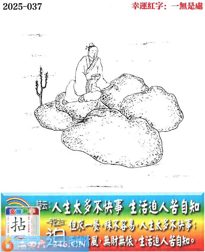 037期老版跑狗一字記之曰:【迫】 詩雲:人生太多不快事,生活迫人苦自知。 但求一餐,殊不容易,人生太多不快事; 兩袖清風,無財無依,生活迫人苦自知。 玄機測字:《拈》