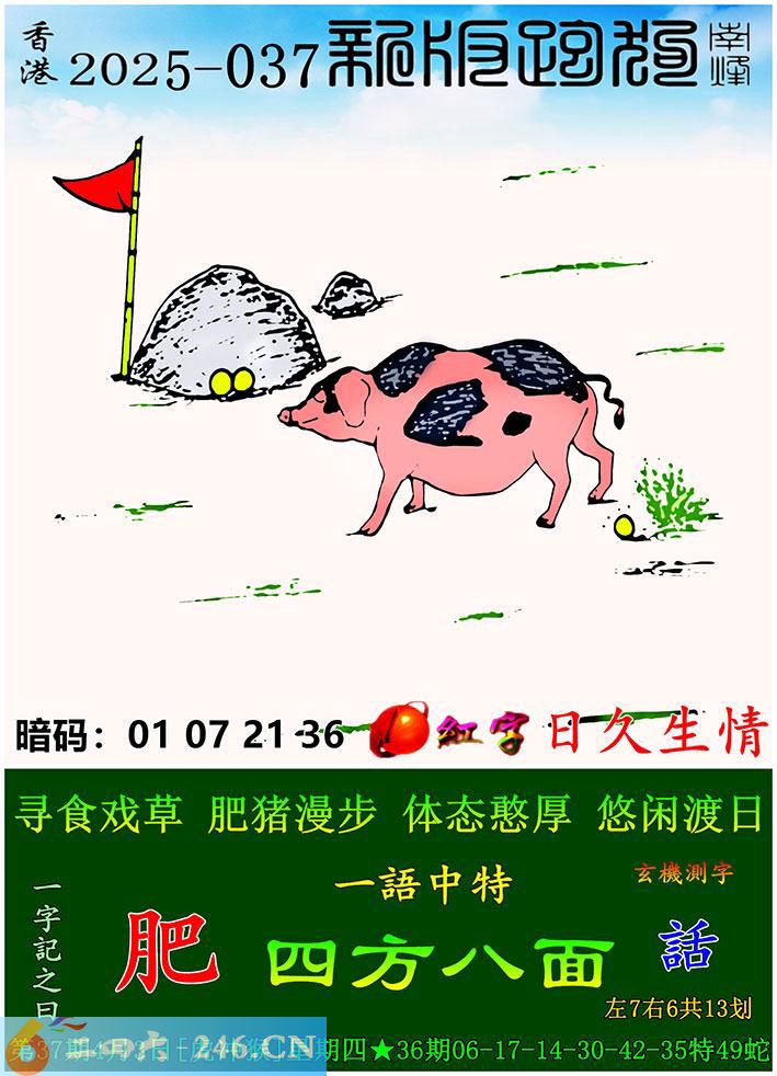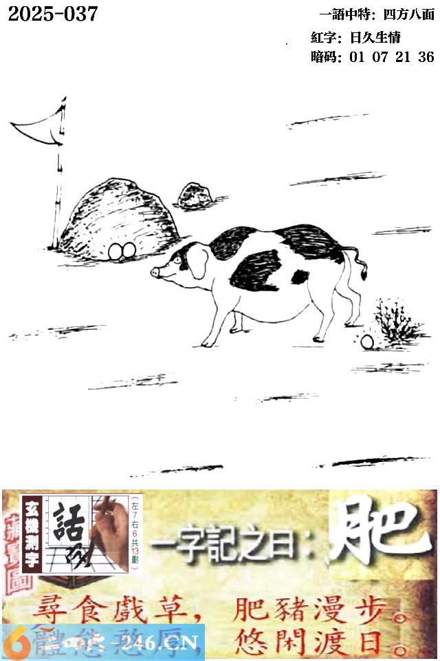037期跑狗一字記之曰:【肥】 尋食戲草,肥豬漫步。 體態憨厚,悠閑渡日。
