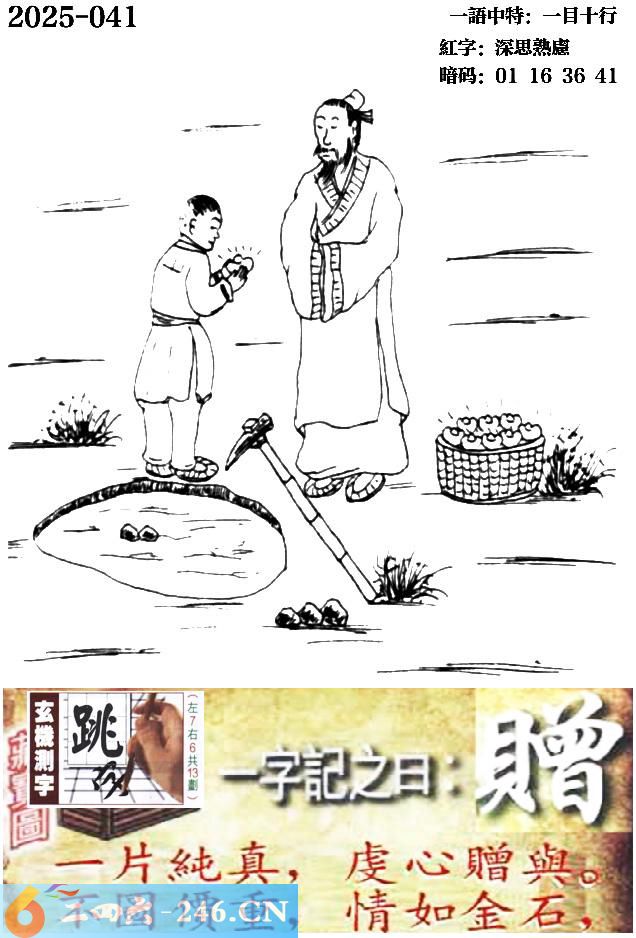 041期跑狗一字記之曰:【贈】 一片純真,虔心贈與。 不圖價重,情如金石。 玄機測字:《跳》 一語中特:一目十行