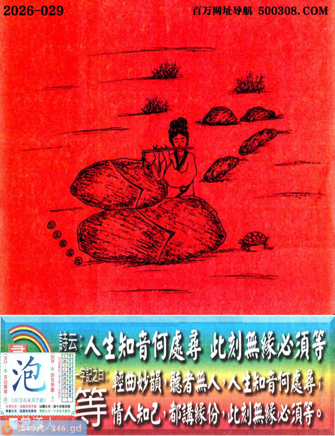 029期老版跑狗一字記之曰:【等】 詩雲:人生知音何處尋此刻無緣必須等。 輕曲妙韻,聽者無人,人生知音何處尋; 情人知己,都講緣分,此刻無緣必須等。 既然无缘注定单身 狗
