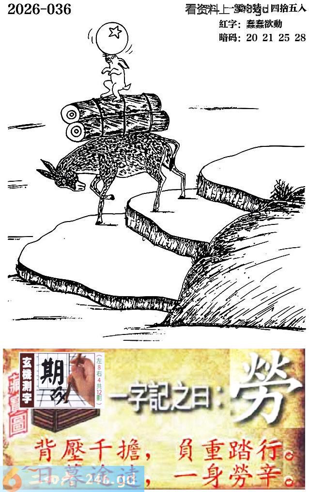 036期跑狗一字記之曰:【勞】 背壓千擔,負重踏行。 日暮途遠,一身勞辛。