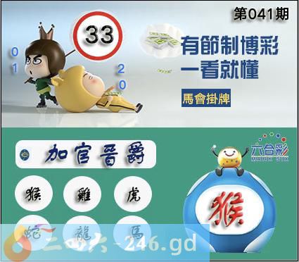 041期正版彩图挂:33 爆:猴 挂牌成语:加官晋爵 挂牌出肖:猴鸡虎蛇龙马